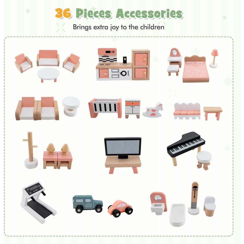 Delight your child with the stunning Costway 36 Piece Green Wooden Dollhouse Set. It is a three-level dollhouse featuring six fully furnished rooms, detailed wallpaper, and 36 furniture pieces. Its splinter-free surface ensures safe play, while the robust wooden construction promises lasting enjoyment. Perfect for sparking creativity and fostering parent-child interaction, this dollhouse is more than just a toy.