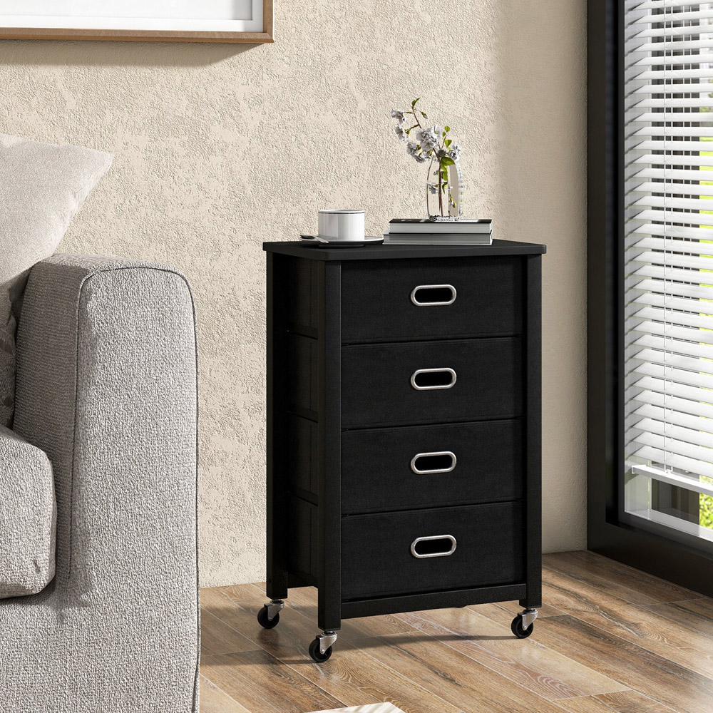 Keep your space tidy and organised with this Costway 4 Drawer Black Mobile Filing Cabinet. Designed to provide ample storage, each drawer has an oval handle for easy access, making it ideal for storing clothes, office supplies, or personal items while keeping them dust-free. Crafted from high-quality fabric and supported by a sturdy stainless steel frame, this cabinet provides durability and stability, with a weight capacity of up to 40lbs. The fabric has good air permeability. Equipped with four universal wheels, the cabinet glides smoothly across floors without noise or scratches, while the built-in brakes allow it to be securely fixed in place when needed. The elegant design fits seamlessly into any room, from the office and bedroom to the study or dressing room, ensuring a clutter-free environment. Designed with rounded corners for safety, this cabinet comes with easy-to-follow instructions for quick assembly, making it a functional and user-friendly addition to the home.