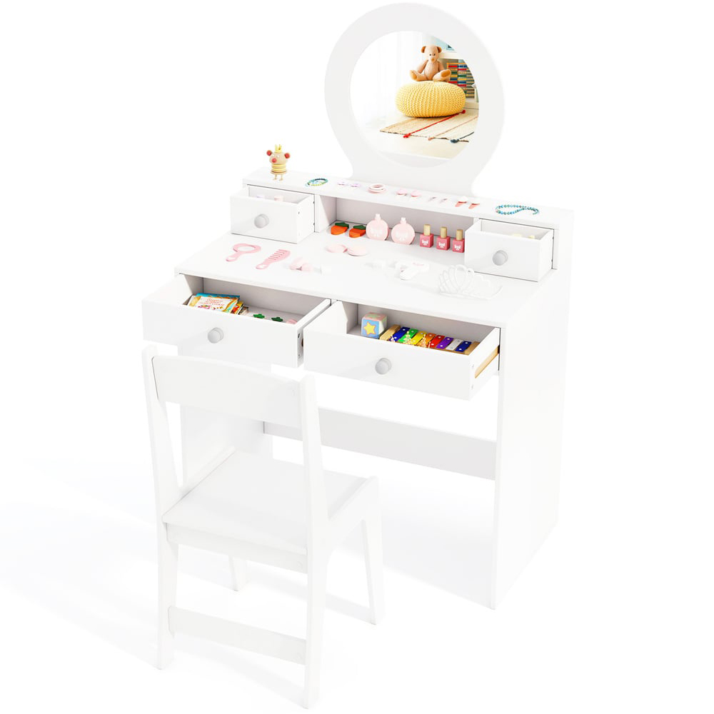 With child-safe features like a shatterproof acrylic mirror and rounded corners, safety is ensured. The princess vanity set comes with ample storage including shelf and drawers for organization. Stability is a priority with an anti-toppling device. This versatile desk and chair set makes a perfect gift for any occasion, providing a safe and enjoyable space for your child to dress up, read, write, draw, and more. Perfect Gift for Kids: Ideal for birthdays, holidays, Christmas, or any special occasion, this multi-use kids vanity set is the ultimate delightful gift for your children, suitable for dressing, reading, writing, drawing, etc. Child-Safe Features: This UKCA compliant princess vanity set features a shatterproof acrylic mirror to withstand playful interactions. Rounded corners minimize the risk of bumps and bruises, ensuring a safer play environment for your little ones. Large Storage Capacity: This kids makeup vanity set comes with an open shelf, 2 desktop drawers and 2 large drawers, offering ample space to store cosmetics, snacks, toys, books, stationery, art supplies, or beauty accessories. Stability and Security: Equipped with an anti-toppling device, this kids makeup desk set can be attached to the wall to prevent tip-over accidents. The robust MDF frame ensure high weight capacity (tabletop: 50kg, chair: 75kg). Simple Installation: This dressing table and chair set comes with numbered parts and step-by-step detailed instructions, making the assembly process easier.