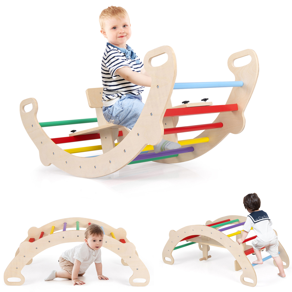 Jumpstart a new level of play with the Costway 4 in 1 Multicolour Toddlers Wooden Climbing Toy. Measuring 44 x 52 x 112cm, this versatile toy is perfect for any indoor place, including playrooms, living rooms, kindergartens, amusement parks, and more. It can be used as a rocking horse, rocking chair, arch climber, or crawling tunnel, offering endless entertainment for your child. Simply twist the knobs to switch between different play modes based on your child’s preferences. For safe and enjoyable rocking, the playset has angle limiters that keep the rocking range within 35°, ensuring stable forward and backward motion. The easy-to-grip handle, comfortable backrest and spacious seat provide extra support and comfort during play. It also meets EN71 standards for added safety. Designed for stability, this playset features anti-rollover devices to keep it steady. The smooth, rounded edges protect your child’s delicate skin, while the colourful beech wood bars make it easy for children to grip as they climb. Suitable for ages one to five years, this playset is the perfect gift for birthdays, Christmas, or other festivals. Apart from offering fun, it also helps children develop balance, motor skills, and coordination abilities during playtime. With a simple design and clear instructions, assembling this playset is quick and easy. Once set up, it can be enjoyed in any indoor space, providing hours of fun and learning.
