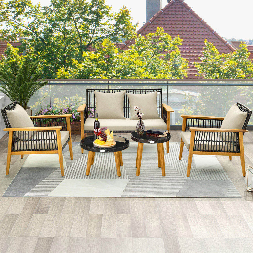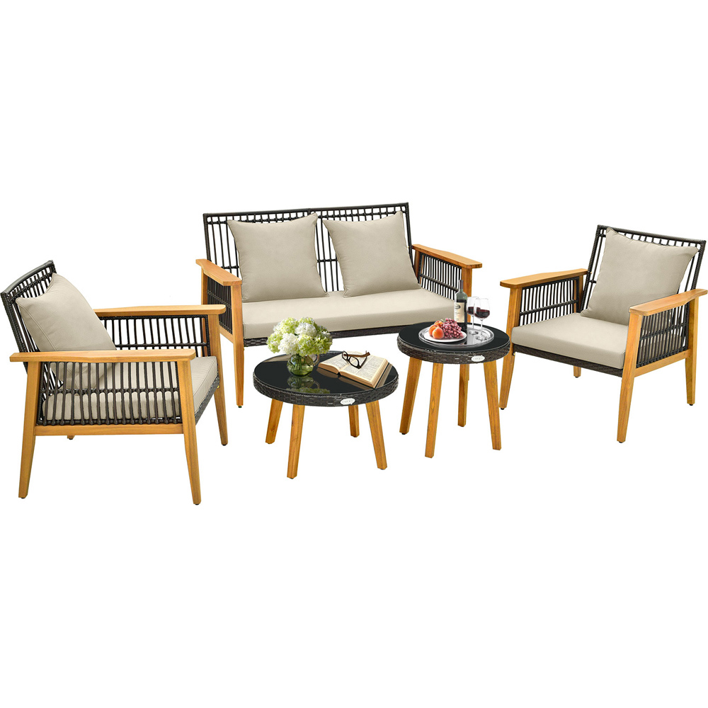 Designed with durable solid acacia wood frame and sturdy metal support, this 5-piece furniture set boasts incredible stability and can withstand extended outdoor use. Sink into plush comfort with the soft seat and back cushions. And the ergonomic backrest offers optimal relaxation for your back, ensuring a truly indulgent experience. Made with beautifully woven mix brown PE rattan, this set is not only elegant but also resistant to fading, ensuring its longevity. Transform your backyard or poolside a soothing heaven with this incredible 5-piece furniture set which is made of high-grade material. Acacia Wood and Metal Support: Firmly supported by solid acacia wood frame and sturdy metal frame, all the 5 pieces are of super high stability and can withstand long-time outdoor use. High-Level Coziness: With soft seat and back cushions featuring high-density sponge, the 3 chairs offer you endless coziness. Plus, the ergonomic backrest will effectively relax your back. Note: Please always keep cushions dry to prolong the service time Due to the light avoidance and light exposure, the colour of the cushions is slightly different. Appealing Woven Rattan: The well-woven mix brown PE rattan is elegant and anti-fading for prolonged using time. And the rattan surface combined with natural and burr-free wood makes the patio set more appealing. Double Round Side Tables: The patio set comes with 2 side tables, making everyone easy to fetch items on the tabletop. Both 2 tables are designed with tempered glass tabletop which is firmly fixed by 3 suction cups. Awesome Outdoor Addition: With high-grade material and cozy seats, this 5-piece rattan furniture set will be fabulous for backyard, poolside and so on. Enjoy outdoor relaxation with your family or friends in no time.