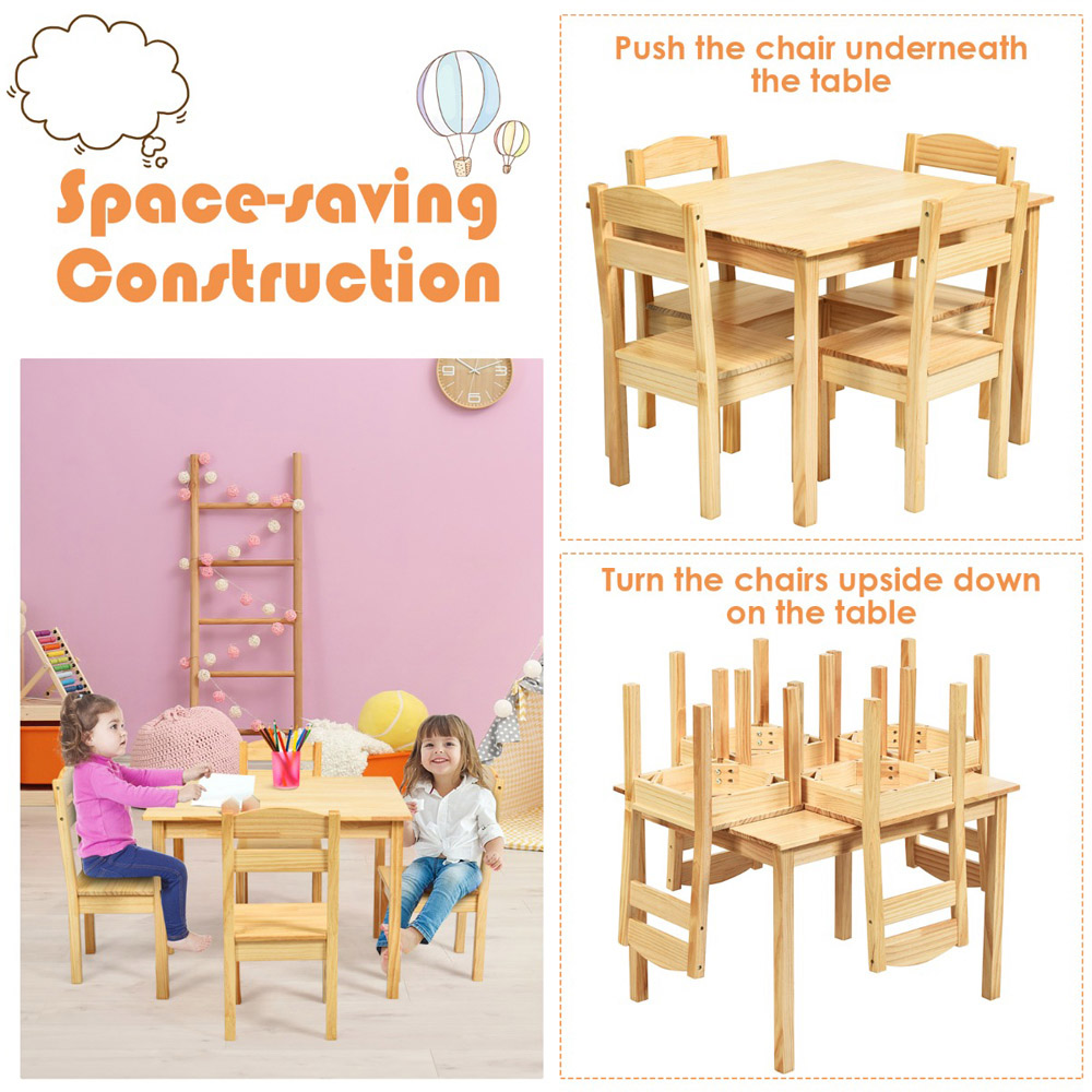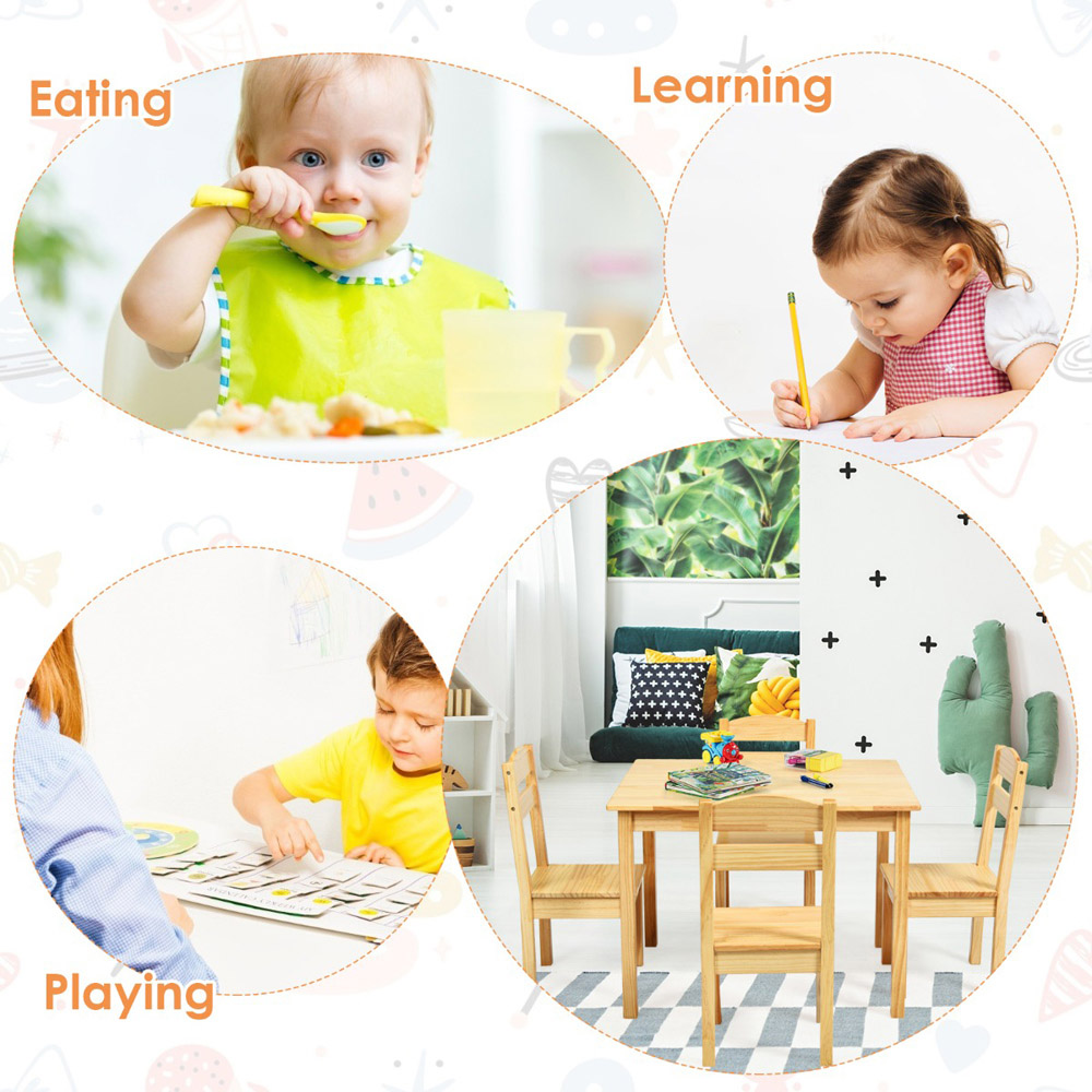 Brighten up your little one's room with the Kids Table and Four Chairs Set for Toddlers, crafted for dining, drawing, and reading. This multifunctional five-piece set is not only versatile but also ensures a safe and sturdy environment for children aged three to seven. Made from natural pine wood and coated with non-toxic, eco-friendly paint, it is designed to support various activities such as eating, reading, and playing. The set's humanised design includes a triangular structure for enhanced stability and ergonomically designed chairs for comfortable sitting. It's perfect for both indoor and outdoor use, making it ideal for any space like the living room, children's room, or playroom. Plus, it's easy to assemble and clean, ensuring that parents have a hassle-free experience.