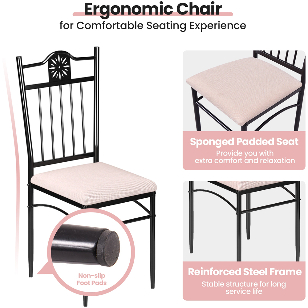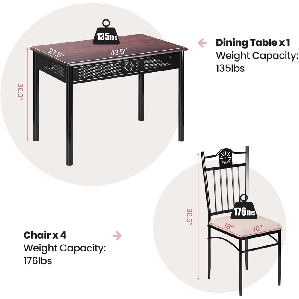 Upgrade your dining experience with the Costway 4 Seater Kitchen Dining Set with Sponge Cushion Purple. This five-piece dining set includes four elegant chairs and a single table. This stylish dining table set is an ideal choice for family gatherings and candlelight dinners. It features a durable MDF tabletop that provides enough space for food and drinks and easy cleanup. The upholstered chairs have sponge-padded premium PU leather surfaces and ergonomically shaped backrests, ensuring a comfortable sitting experience. It boasts a modern and elegant appearance, seamlessly complementing your kitchen and dining room. This dining table set provides a good gathering place for you and your family. The natural wood grain and black metal texture match seamlessly with interior decoration. This dining table set has a cutout pattern that makes an instant upgrade in style and adds a refined sensation to any place.