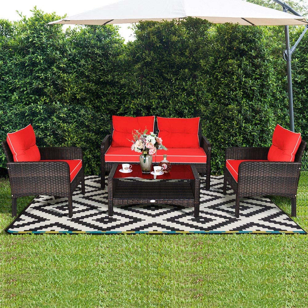 Enjoy a pleasant leisure time with your family or friends on this conversation set! Coming with 2 armchairs, 1 loveseat and 1 coffee table, this patio couch set provides 4 seats for you and your friends or family. With the high-resilient cushions, backrests and armrests, you guys can sit comfortably around the table in the open air to eat, drink and talk. Besides, the storage shelf also allows you to place various daily items. If you need to, you can freely change the combination of this furniture set in the way you like. As for cleaning, the seat cushion covers are fitted with zippers and easy to remove. And the tempered glass tabletop is smooth enough to be easily cleaned. In general, this furniture set made of all-weather PE material is a great addition to various outdoor occasions. Durable Material and Stable Structure: Made of PE rattan, this patio conversation set is weather-resistant and can be used outdoors for a long time. Moreover, the reinforced steel frame shows a strong bearing capacity. The adjustable foot pads help to easily stand on uneven ground and make it more stable. Table with Storage Space: The table of this patio furniture set features a large tempered glass tabletop and a storage shelf, so that you can store various items, such as food, fruit, magazines, etc. What's more, the tempered glass tabletop allows you to easily wipe off the stains with a soft cloth. Super Comfortable Seat: 2 single chairs and the loveseat are equipped with seat cushions and back cushions padded with soft sponge. And with wide backrests and ergonomic armrests, you can fully relax on the sofa. Besides, the zippered covers of the seat cushions are removable for easy cleaning. Note: Due to the light avoidance and light exposure, the colour of the cushions is slightly different. Free Combination: The table, loveseat and 2 armchairs enable you to freely combine them according to your preferences or the space of different places. With a modern and simple design, this 4 PCS outdoor sofa set is an ideal addition to the backyard, poolside, garden and other outdoor places. Easy to Set up: This wicker sectional sofa set will be shipped in 2 packages that may arrive on different dates. By using the hardware and following the user manual with detailed steps, you can easily and quickly complete the assembly. Please do not tighten all the screws until all the holes are aligned to facilitate the installation