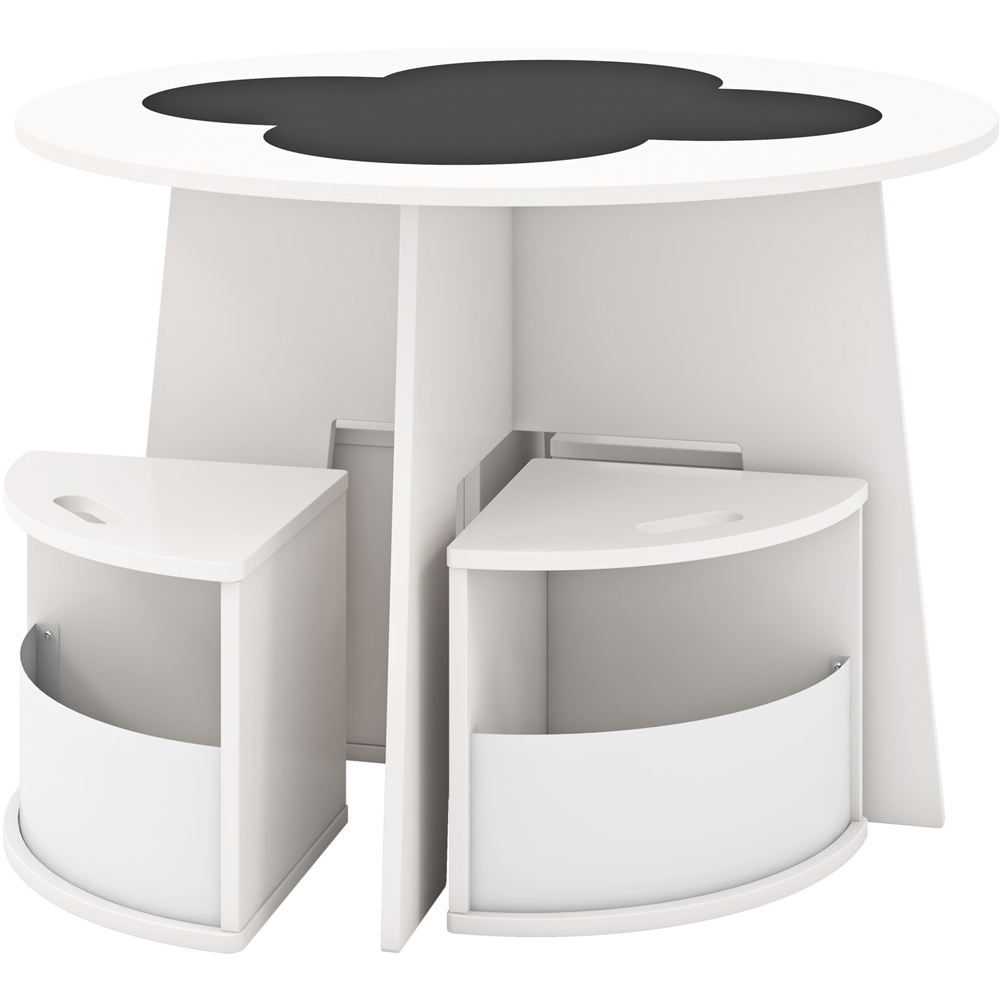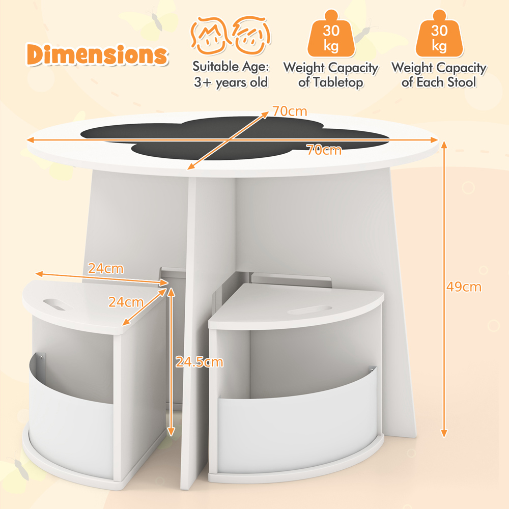 Maximize space and encourage creative play with this innovative kids table and chair set. There is a blackboard tabletop for drawing or writing, which is great for toddlers’ creativity and imagination stimulation. Featuring a space-saving nesting design, 4 stools can tuck neatly under the table. Ideal for various activities, this set includes integrated storage bins under each stool for easy access to toys, books, and more. Designed with safety in mind, the toddler wooden table and chair set boasts smooth edges. With a waterproof finish for easy cleaning, built-in carry handles for portability, and a stylish flower-shaped design, this versatile set adds functionality and charm to any modern home. Bullet Point: Space-Saving Nesting Design: This innovative kids table and chair set features 4 stools that tuck neatly under the table, maximizing space in any room when not in use. It is perfect for versatile activities such as eating, drawing, learning, and playing. Writable Blackboard Tabletop: There is a blackboard tabletop for drawing or writing, which is great for toddlers’ creativity and imagination stimulation. The waterproof finish provides an easy-to-clean surface for hassle-free maintenance. Integrated Storage Solution: This toddler table set helps keep play areas clutter-free with handy storage bins located under each stool’s seat, ideal for holding toys, books, snacks, stationery and craft supplies. It helps to develop good storage habits in your kids. Additionally, the stools include built-in carry handles for easy portability. Robust & Safe Construction: Designed with your child's safety in mind, this wooden table and stool set complies with UKCA, ensuring a secure environment for playful activities. Smooth and round edges avoid injuries, and anti-scratch foot pads protect the floor from damage. Versatile Addition: Boasting an unique flower-shaped design , this nesting table and stool set is a stylish addition to any modern home. Whether placed in the living room, bedroom, playroom or classroom, it seamlessly integrates with existing decoration, providing functional furniture for children’s activities.