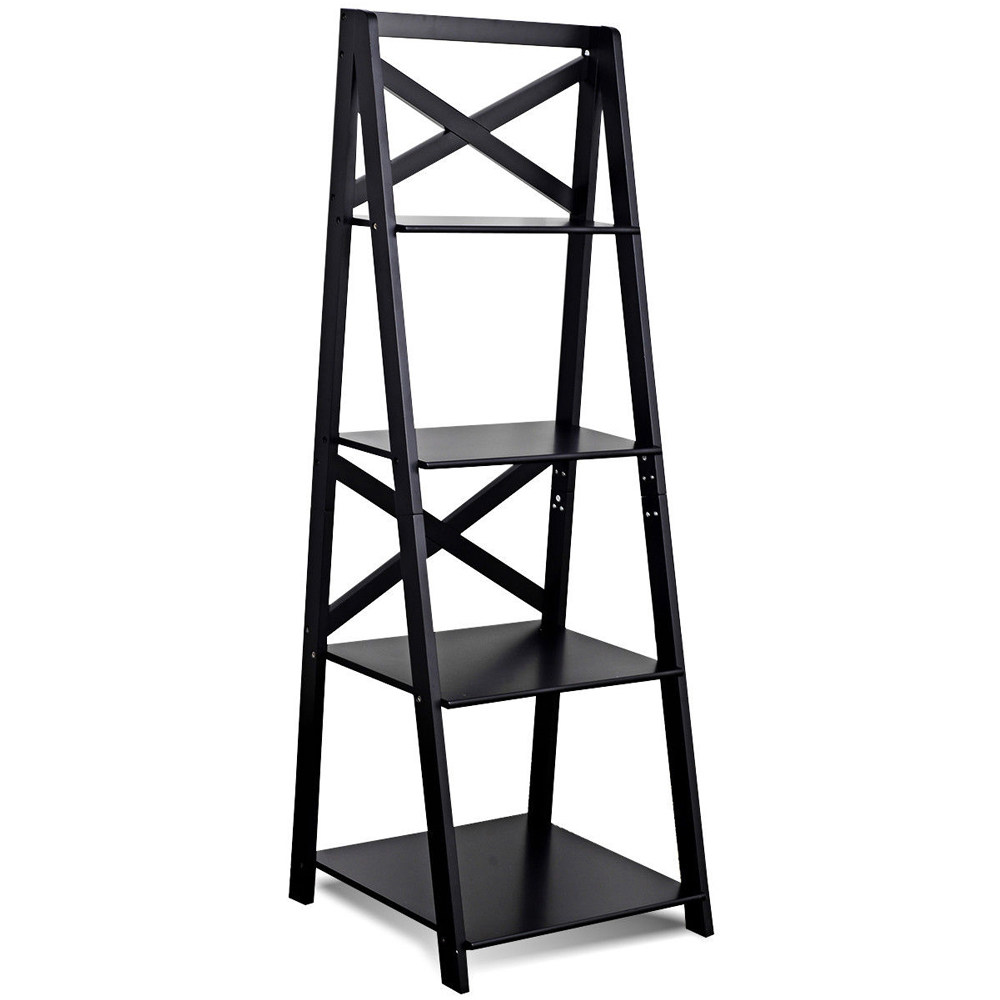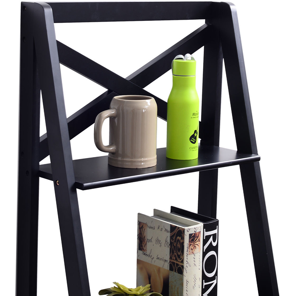 Make a soothing and functional addition to your home decor with the Costway 4 Shelf Black Wooden Ladder Bookcase. This shelving unit is ideal for your bedroom, living room, study or office and provides you with great storage for books and other daily essentials. This ladder-styled shelving unit is ideal for keeping books, pictures, ornaments and plants. The simple design features two X-bar backs which provide stability and a stylish look. The four shelves get deeper towards the bottom, allowing larger items to be displayed with convenience. It is crafted using sturdy P2 MDF for durability and stability and is easy to clean for maintenance purposes. It is easy to assemble with the detailed instructions included.