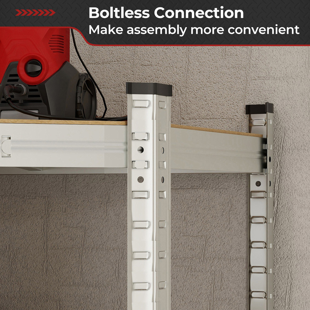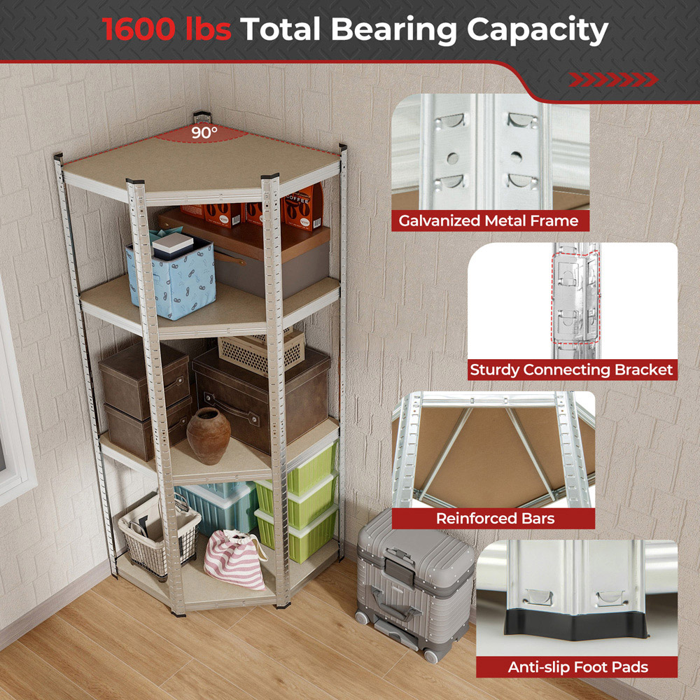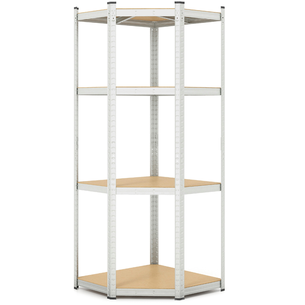 Keep your essentials easily accessible with the Costway 4 Shelf Silver Corner Shelving Unit. Made from a heavy-duty galvanized metal frame, this storage rack is ingeniously designed for corner placement, maximizing your space without causing any intrusion. The four open shelves provide vertical storage space and can hold up to 180kg each, offering strong support. All of them are adjustable to accommodate different items. The included two anti-toppling devices ensure stability, eliminating the risk of tipping. The anti-slip foot pads grip the floor, securing your unit and items in place and protecting your floors from damage. With a boltless design, this warehouse shelving offers simple assembly to save time and labour. It is recommended to use a rubber hammer (not included) for assistance.