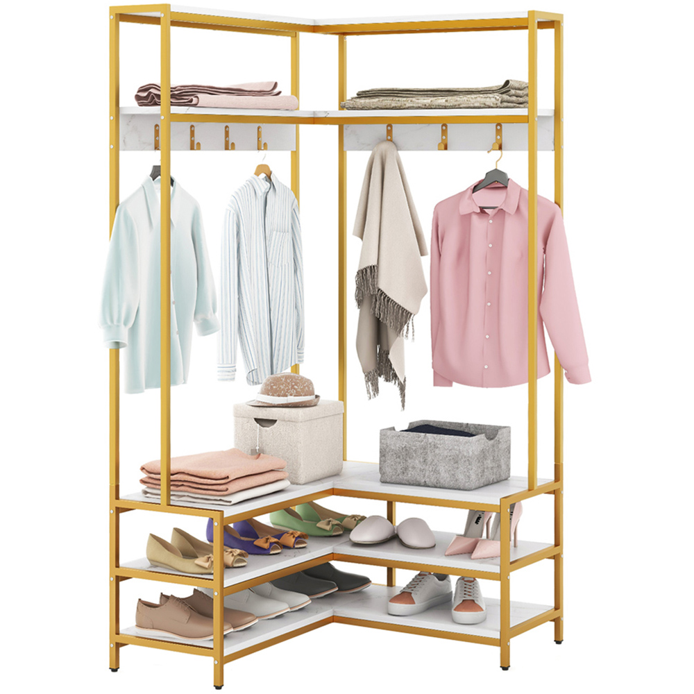 Elevate your home's organisation and style with the L-shaped Clothes Corner Garment Rack, ingeniously designed to fit snugly into any corner, maximising your space while providing ample storage. This multifunctional piece not only serves as a coat and shoe rack but also as a display shelf and a bench, making it an indispensable addition to your entryway, living room, or bedroom. The elegant white finish with a black or golden frame enhances any decor, seamlessly blending with various styles. Its robust metal structure is complemented by adjustable foot pads and anti-toppling devices, ensuring stability and safety. The easy-to-clean surface promises low maintenance, keeping your space tidy and stylish with minimal effort.