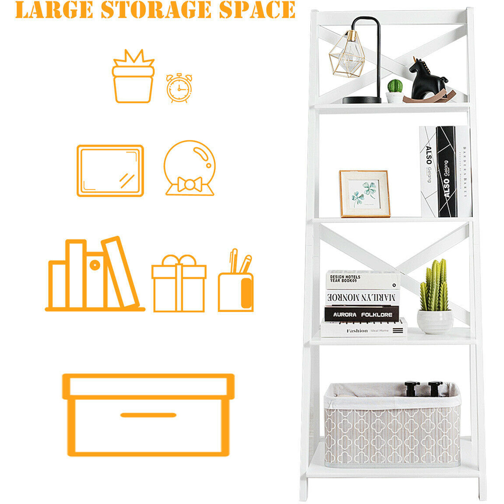 Keep your ornaments organized with the Costway 4 Shelf White Wooden Ladder Bookcase. This four-tier ladder unit is perfect for your bedroom, living room, study, or office, providing an excellent storage solution for books and other daily essentials. The ladder-style design is ideal for books, pictures, ornaments, and plants. Its simple design features two X-bar backs for stability and a stylish look. The four shelves are deeper towards the bottom, capable of displaying larger items. Available in black or white, the MDF material is easy to keep clean and the unit is simple to assemble with detailed instructions included. The smooth wooden surfaces are easy to maintain, and the unit is made from high-quality material for durability and stability, while its practical design complements any décor.