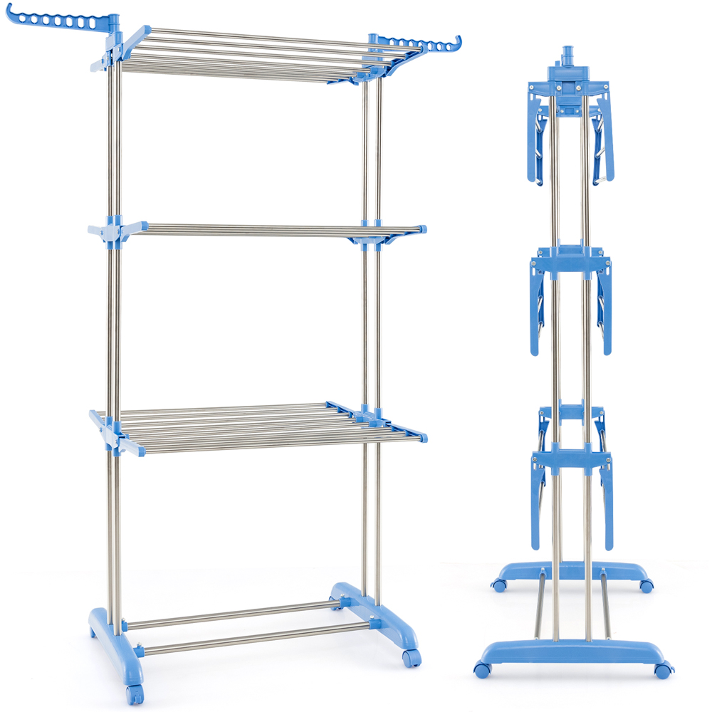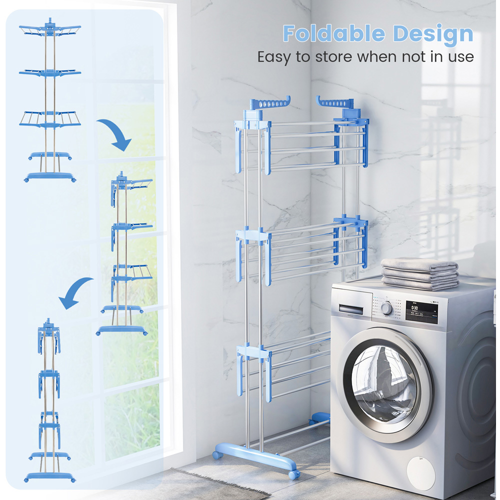 Get ready to revolutionise your laundry routine with the Costway 4 Tier Foldable Clothes Drying Rack. Featuring a remarkable foldable design, this super large clothes drying rack can be used in dorms, apartments or laundry rooms where space is limited. The drying rack can be folded down to a small size of 76 x 52 x 171cm, making it easy for you to organise and store. This drying shelf is made of selected metal to ensure its structure is stable and won't wobble. In addition, all metal parts come with a rust-resistant coating, increasing the product's lifespan. The drying rack provides an overall load capacity of up to 40kg. This rack comes with four casters on its base, making it easy for you to move it to any place. This rack includes four very smooth wheels and does not make extra noise while using them. In addition, two of the wheels are equipped with brakes to help you always secure the drying rack. This drying rack comes with a detailed instruction manual. Therefore, you can assemble it very quickly and easily. The parts are labelled to make sure you don't miss any installation steps. This stylish drying rack is suitable for different scenarios, whether it is a patio, living room, balcony or laundry room.