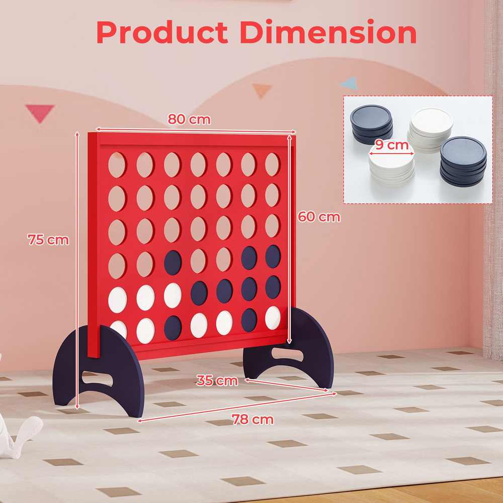 Get ready for an unforgettable game night with the Costway 42 Piece Red Jumbo Rings Giant 4-to-Score Game Set with Carrying Bag. This 4-to-score game comes with the simple rules: The first person who connects 4 chesses in a straight line (horizontal, vertical or diagonal) to win the game. It can help to develop intelligence, exercise logical thinking and enhance hand-eye coordination. Besides, it comes with exquisite details such as 42 chips (21 red + 21 white), sturdy feet, smooth edges, and a one-hand release lever for seamless gameplay. Immerse yourself in the game quickly with the easy 3-step installation process. Just simply place the support feet, insert the board, and finish with the wooden holder. It also complies with BS EN71 to ensure safe use. Children can take this lightweight 4-in-a-row game anywhere easily. It comes with a 600D wear-resistant fabric handbag to make carrying the game set a breeze. This game set is designed to bring joy to a multitude of scenarios. Plus, it is also easy to clean, which saves you lots of energy and time. Plus, the sturdy feet and smooth edges offer you a safe and stable game experience. It also comes with a convenient one-hand release lever to ensure seamless gameplay. Due to its portable design, whether it's a family gathering, birthday party, picnic, or any indoor/outdoor activity, this versatile game set is sure to create memorable moments.