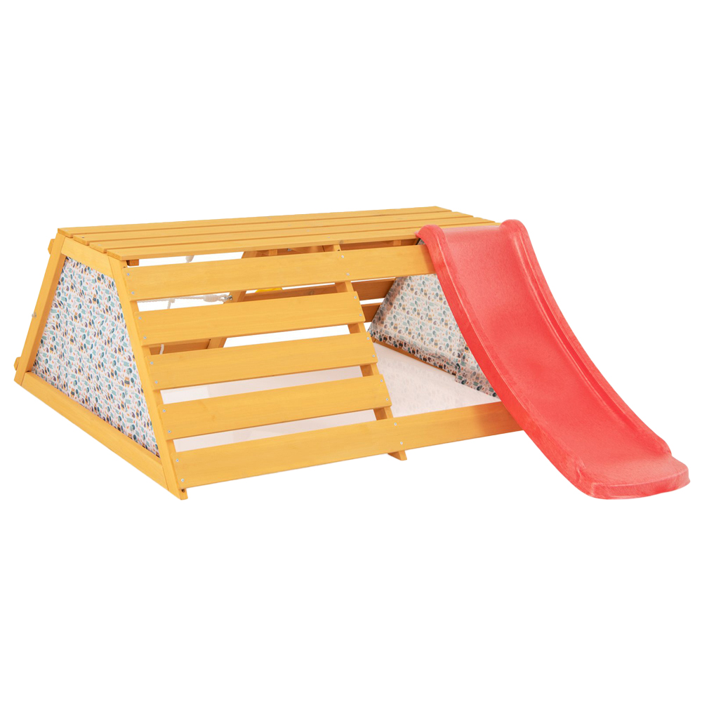 Crafted from solid fir wood, this wooden playground supports 200kg and offers a safe environment for kids to play. Its top area, a climbing wall, a slide, a rope climber, and two removable door curtains, make the climbing playset a perfect gift for children aged three to eight years old and develop their motor skills, balance, and creativity. Every detail of this climbing playset caters to children—the slide’s handrails, the climber’s rocks and the sturdy ropes are built to withstand years of energetic play. Whether for indoor or outdoor use, this wooden climber set is the centrepiece of joyful childhood memories. Please take it indoors when not in use. Note: For safe use, please supervise your children when they are playing.