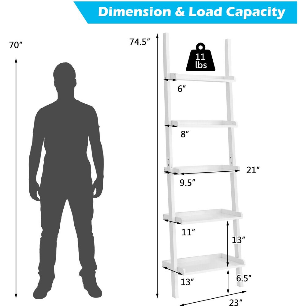 Organize your books neatly with the Costway 5 Shelf White Wooden Bookcase. This bookcase is made from strong, durable material and has five open shelves for your books, photos, and decorations. It has a unique space-saving design that leans against the wall, making good use of vertical space while keeping your room tidy. This bookshelf suits the living room, bathroom, or study room and can also be used as a display rack or storage shelf. With five large wood shelves, there's plenty of space for your items. The space between each shelf allows for tall items and flexible display options. It's easy to clean and has smooth surfaces to prevent scratches.