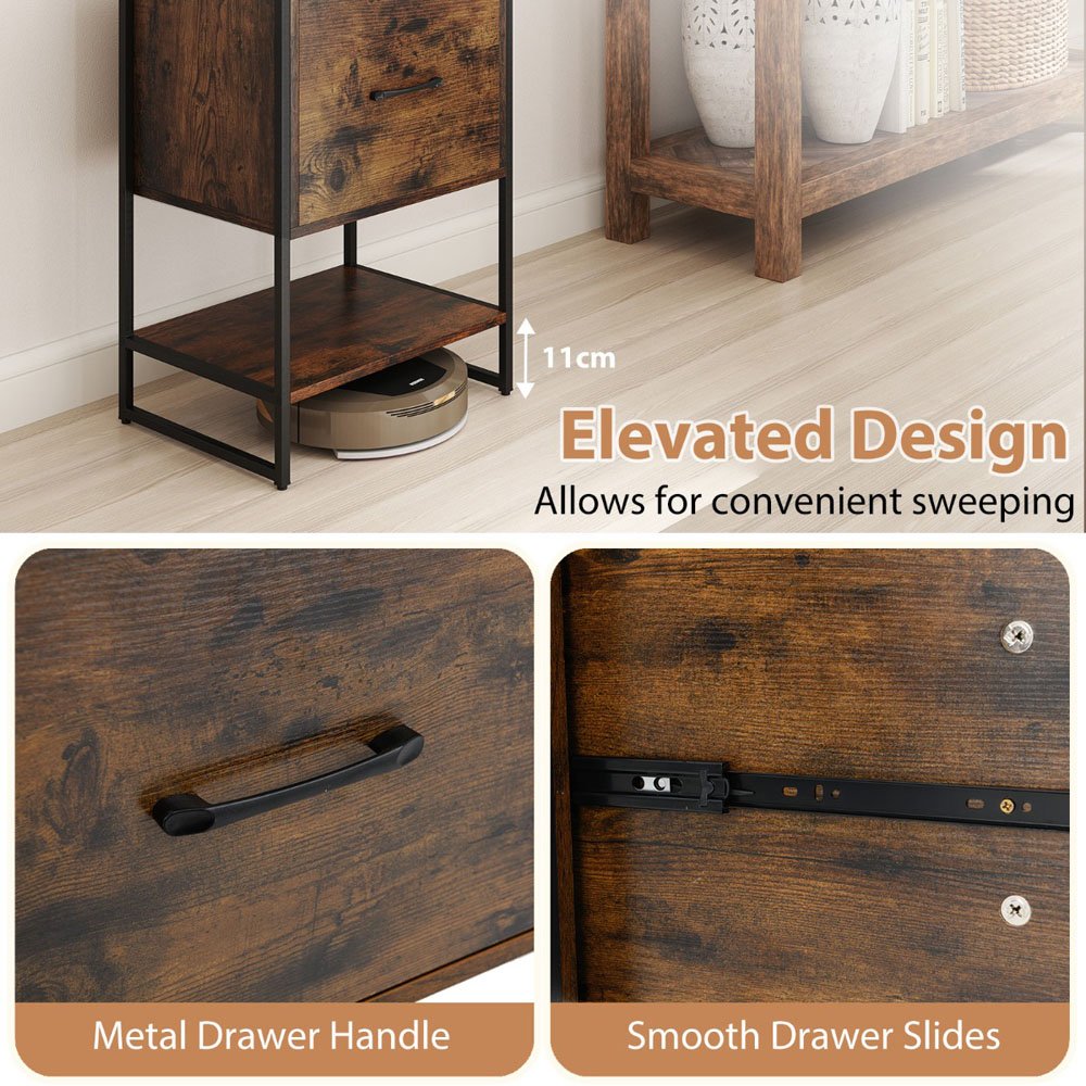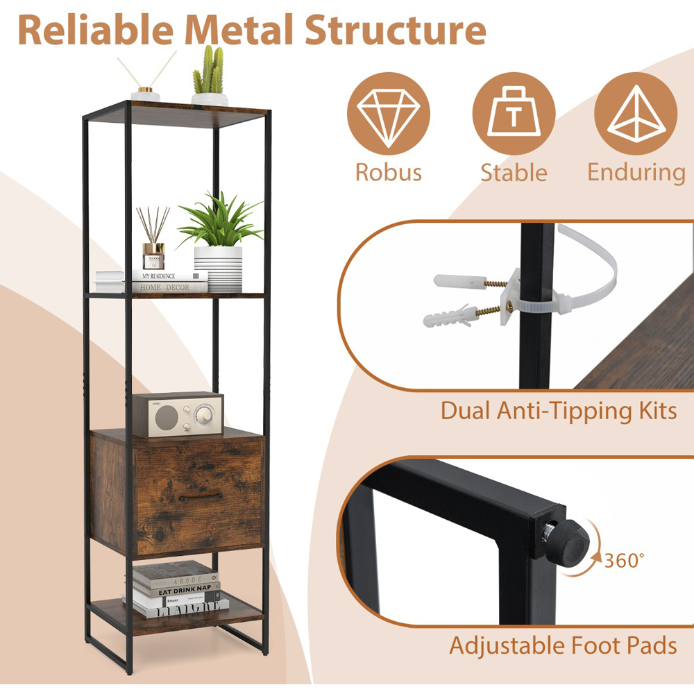 Maximize your storage elegantly with the 5-Tier Tall Narrow Bookcase Bookshelf with Drawer in Rustic Brown, a perfect blend of functionality and style. Its robust metal frame supports up to 60 kg, while the slim and tall design ensures it fits seamlessly into smaller spaces without compromising on storage. Equipped with premium features like an elevated base for easy cleaning and smooth metal drawer slides, this bookshelf is an ideal choice for organizing books, decor, and more in any room.