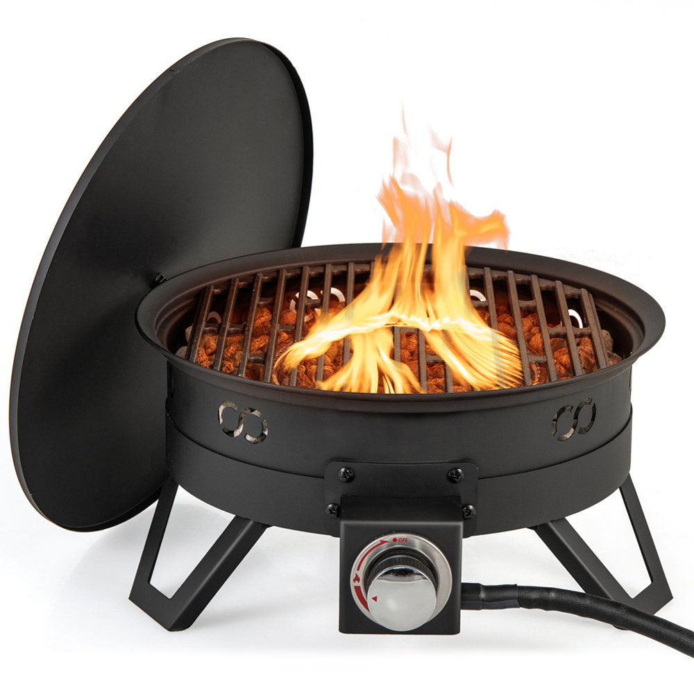 This dual-function pit not only serves as a robust 58,000 BTU heater but also includes a cooking grill for your culinary outdoor activities. Forget the hassle of starting a fire; our fire pit features a safe and easy-to-use ignition system that lets you adjust flames with ease. With foldable legs, this fire pit ensures portability and is complemented by a convenient carrying bag. Make every outdoor moment unforgettable with this ideal patio addition. 2-in-1 Versatile Fire Pit: With a cooking grill included, this portable fire pit doubles as a grill, offering the perfect solution for both heating and outdoor cooking. Its 58,000 BTU heat output will quickly drive away your coldness. Safe and Simple to Ignite: Equipped with a straightforward ignition system, this propane firepit ensures safety and ease during operation. The functional ignition device makes it flexible to adjust the fire as you need. Folding and Portable Design: Featuring foldable legs, this fire pit can be folded into a compact size when not in use. It also comes with a convenient carrying bag, making transportation a breeze. Complete Accessories: Everything needed comes packed in one set, including lava rocks, a tank seat for 9kg propane cylinder, a cooking grill and a lid with handle. This comprehensive package ensures you can set up your fire experience right out of the box. Ideal Patio Addition: Enhance your backyard or patio ambiance with this elegant and compact fire pit. Its sleek design and versatile functionality make it a perfect centrepiece for outdoor gatherings. Note: 1. Please do not completely cover the burner with lava rocks when igniting.2. Please keep volcanic rocks always dry to prevent splashes when using.