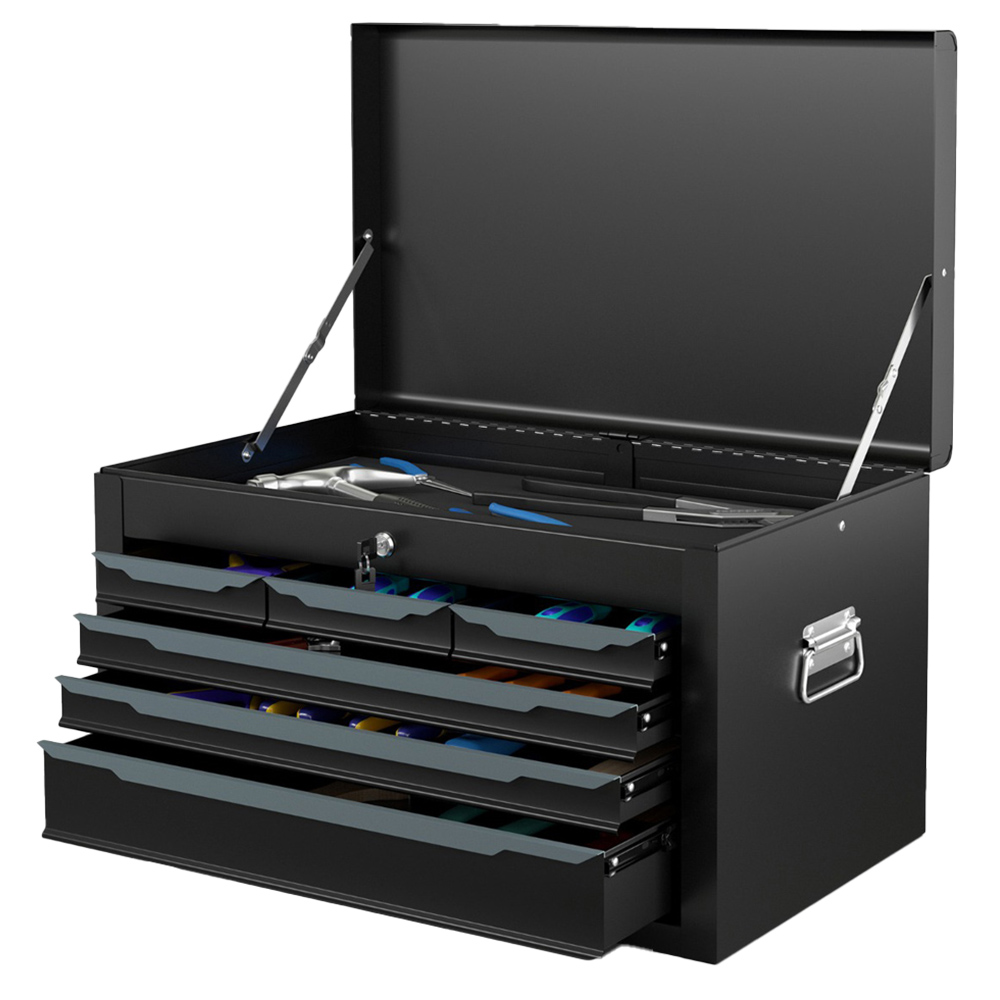 Elevate your tool storage game with this Costway 6 Drawer Black Steel Tool Box Chest Case, featuring a top compartment and six drawers, all secured with an innovative automatic lock system. This lockable tool chest ensures your tools are safe and organised, whether in the garage, workshop, or home. Its smooth ball-bearing slides allow for effortless access to all drawers, while protective EVA liners keep your tools in pristine condition. Ideal for anyone looking to streamline their workspace and keep their tools neatly arranged and secure.