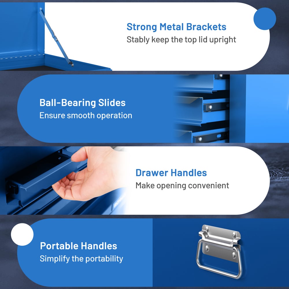 Unlock the potential of your workspace with the Costway 6 Drawer Blue Steel Tool Box Chest Case, featuring a top storage compartment and six drawers to keep your tools neatly organised and secure. This blue steel tool chest is equipped with an automatic lock system that activates when you close the top lid after fully inserting the drawers, ensuring all your tools are safe and accounted for. The smooth ball-bearing slides make drawer operation seamless, while the protective EVA liners keep your tools cushioned and free from damage. Whether in a garage, workshop, or home, this tool chest is an ideal solution for maintaining an organised and efficient work environment.