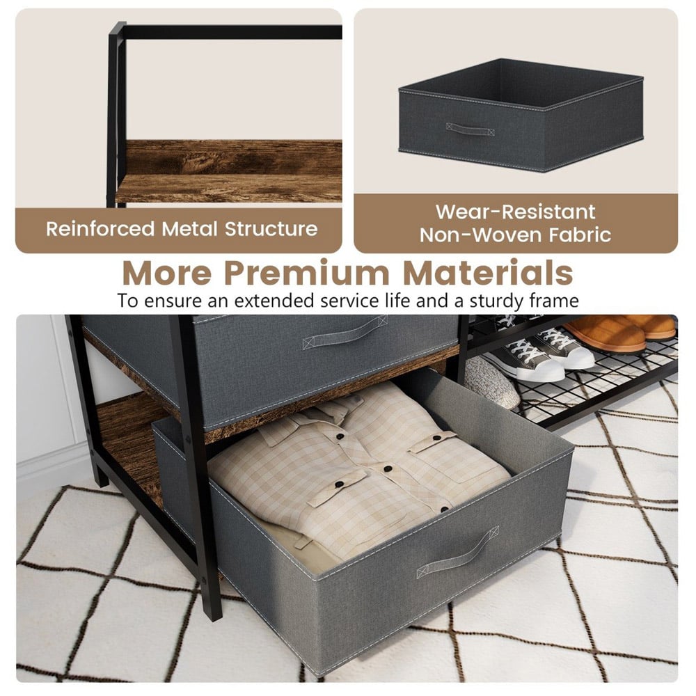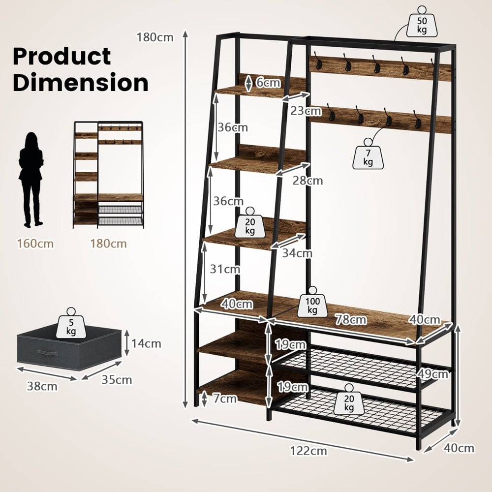 Maximise your space and maintain a tidy home with the Costway 6 in 1 Freestanding Coat Rack. This multifunctional hall tree features nine dual hooks, six-tier shelves, two foldable fabric dressers, a shoe bench, and a two-tier shoe rack, providing ample space for all your essentials, from hats and bags to shoes and clothes. Sit comfortably on the bench while changing shoes or transform it into an additional storage shelf. For added flexibility, the fabric dressers can be removed to display ornaments or store other items. Crafted from solid steel and engineered wood, this coat rack is built to last and includes safety features like anti-toppling devices and raised shelf edges to keep your belongings secure. The smooth, waterproof surface ensures easy maintenance, making it an ideal choice for any home.