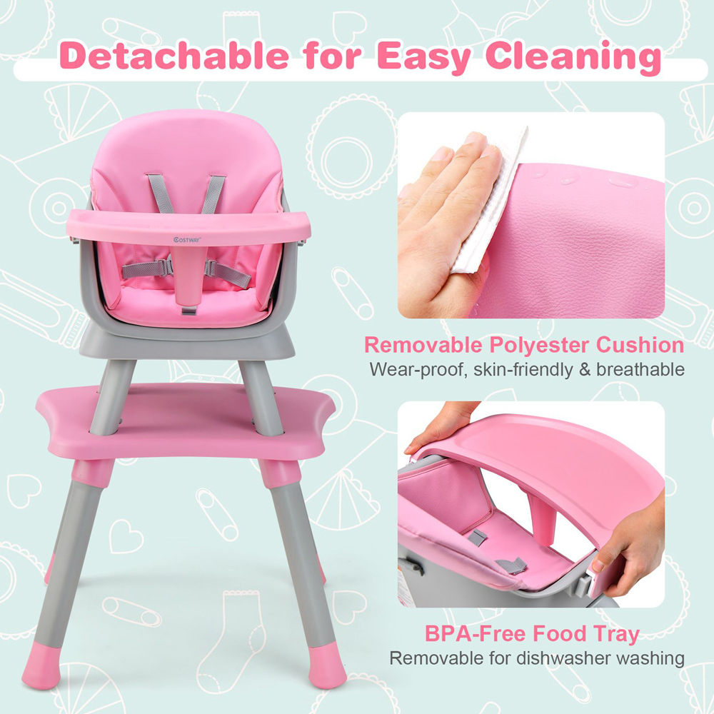 Let your child’s mealtime become a delighted occasion with the Costway 6 in 1 Pink Baby Highchair with Removable Tray. Apart from using as a full-size highchair, you can also utilise it as a booster seat, baby feeding low chair, kids study table and chair, building block table and chair and toddler stool. It offers six modes to satisfy different needs of your child. Featuring a detachable building block tabletop, this highchair offers your child the flexibility to use it while writing, drawing, studying, and playing. Plus, the baby booster seat is compatible with maximum dining chairs since it comes with a fixing strap to let your children join the dinner table. It features a pyramid structure and anti-slip foot pads to improve the stability. Plus, this chair comprises a five-point safety harness, anti-falling safety baffle and round corner and smooth edge, presenting a safe environment for children. The food tray is constructed from BPA-free and durable PP material to ensure longevity and safety. It also offers three adjustable positions to fit children of different sizes. Plus, this tray can be removed from the main body as well for cleaning purposes. It is dishwasher safe, waterproof and easy to clean. This chair is intended with a soft sponge padded seat and backrest cushion to make your child more comfortable. This cushion is adorned with a cover which is skin-friendly, anti-wear and waterproof, allowing you to wipe it easily. Given the buckle-connected design, the highchair can be installed simply and promptly.