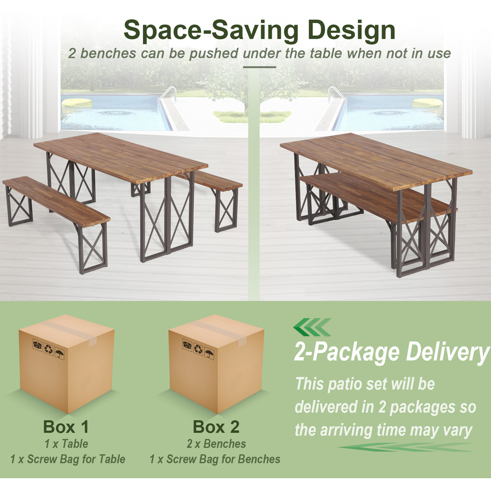 Elevate your outdoor dining experience with the 3 Pieces Outdoor Acacia Wood Dining Set, featuring a convenient 4.5 cm umbrella hole for those sunny days. Crafted from solid acacia wood and supported by a rustproof metal frame, this set ensures durability and stability, making it perfect for any outdoor setting. The spacious tabletop serves as an ideal spot for gatherings, while the two widened benches can comfortably seat up to six people. Its clever design allows the benches to tuck neatly under the table, maximizing your space when not in use.