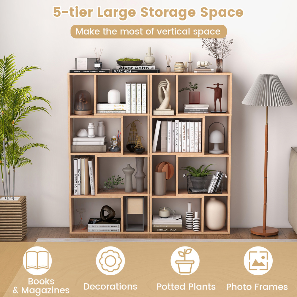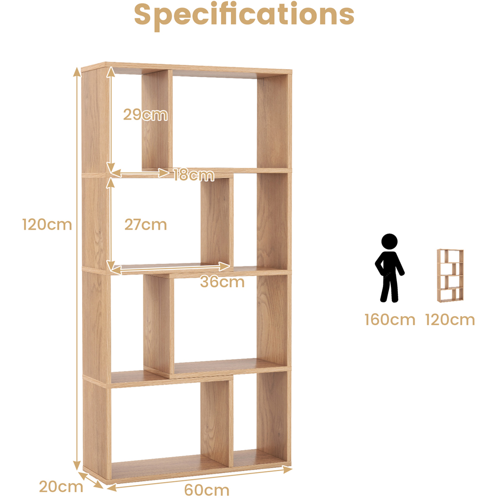 Enhance your space with the Costway 8 Cube Natural Geometric Bookshelf, a perfect blend of style and functionality that brings a modern touch to any room. This striking bookshelf features a unique geometric pattern that not only serves as a captivating focal point but also offers practical storage solutions. With eight open cubes, it provides ample space to display books, collectables, and decorative items, while ensuring they are easily accessible. Crafted from thickened engineered wood, this floor-standing bookcase is robust and designed to support a total weight of up to 130kg. It includes two anti-toppling devices, guaranteeing stability and safety for both heavy and light items. Whether used in your living room, study, or office, this multifunctional bookshelf combines the best of aesthetics and utility, making it an ideal choice for those seeking both style and substance.