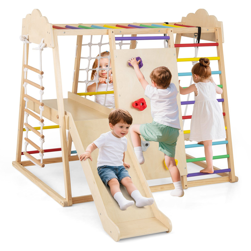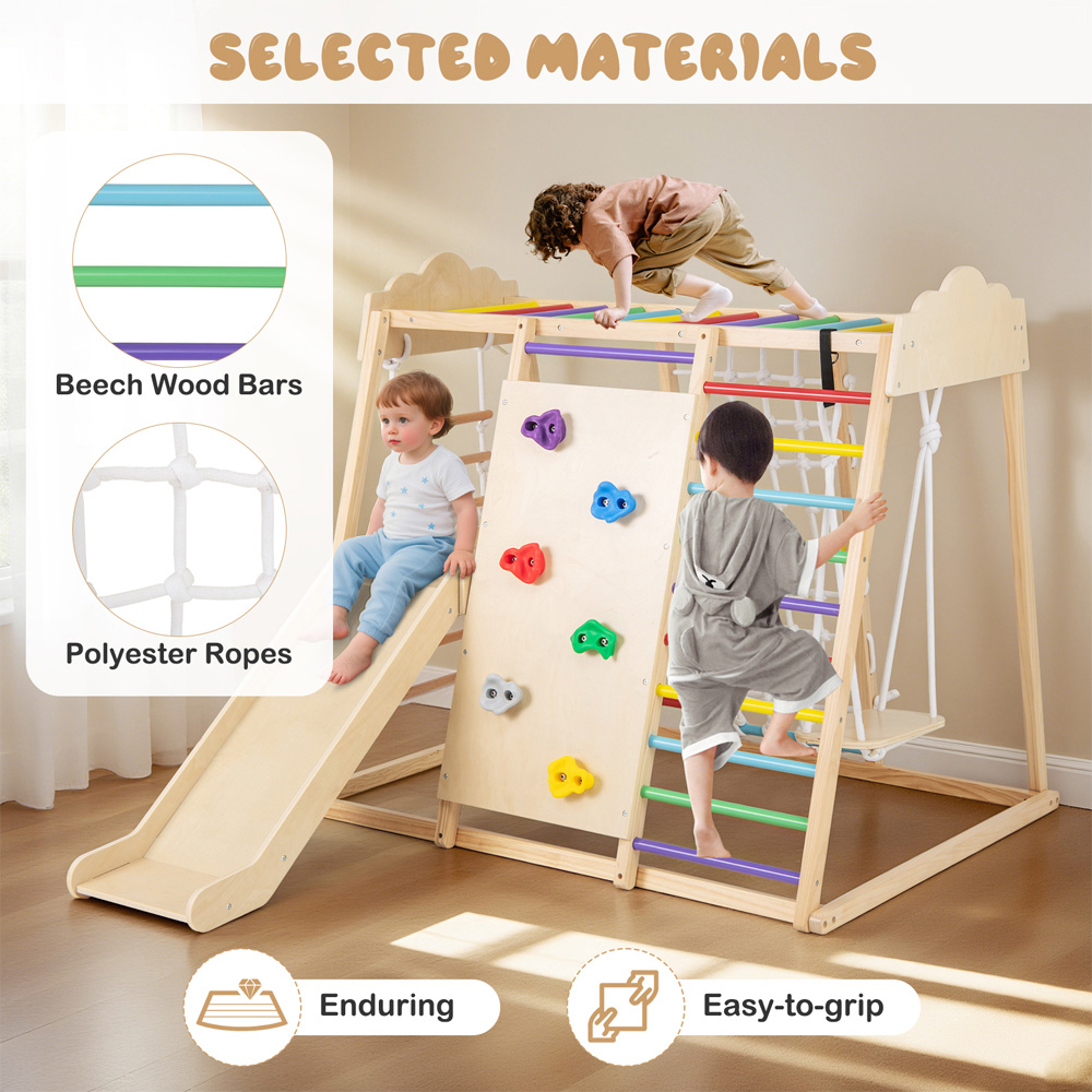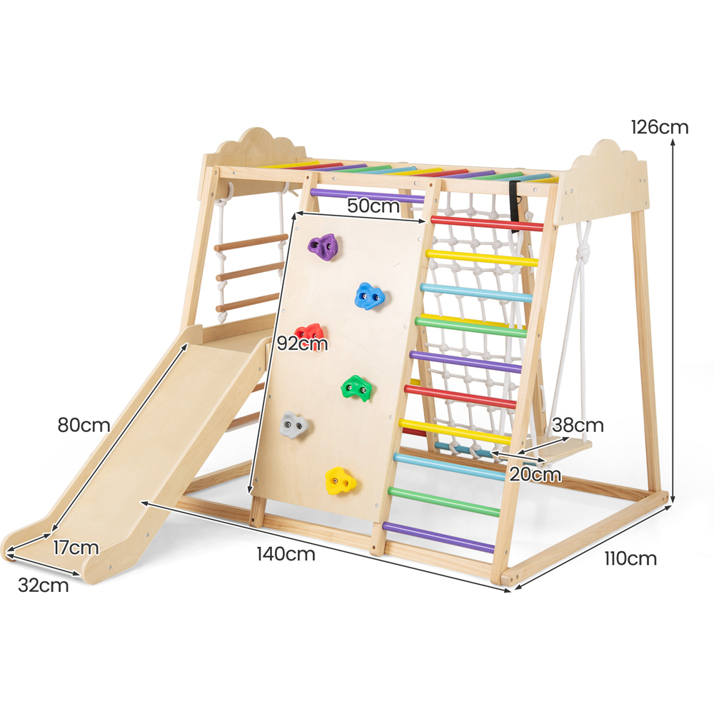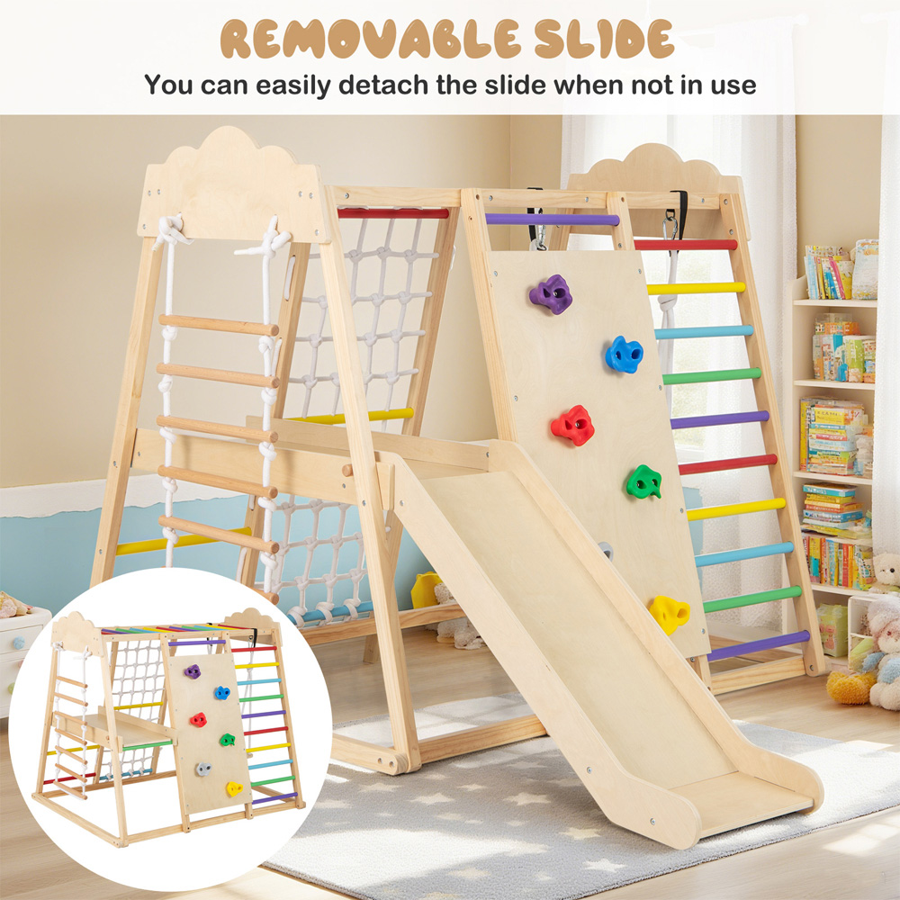 Transform playtime into an adventure with this Costway 8-in-1 Kids Wooden Montessori Climbing Toy, designed to inspire active fun and support your child's physical development. Featuring eight exciting activities, including monkey bars, a removable slide with a buffer zone, a swing, rope and climbing ladders, climbing rocks, a platform, and a climbing net, kids can improve their motor skills and coordination. Crafted from beech wood bars and durable polyester ropes, the splinter-free frame uses water-based paint and rounded edges for added safety, and the solid trapezoidal structure supports up to 140kg. Perfect for any playroom or kids' space, it's easy to adapt as children grow, making indoor play both safe and engaging.