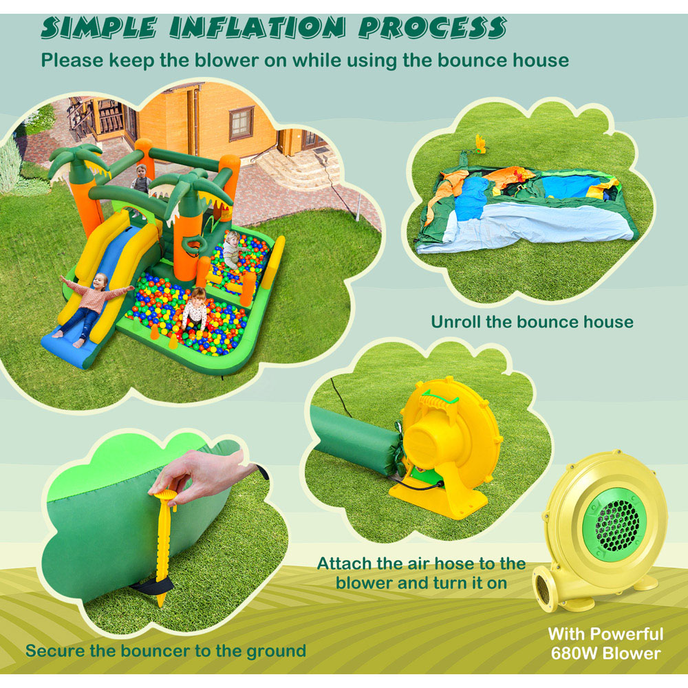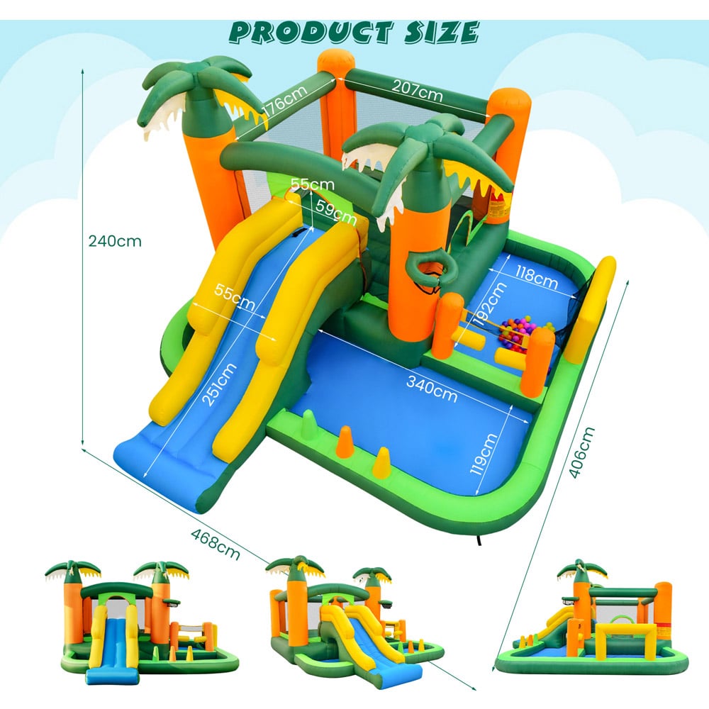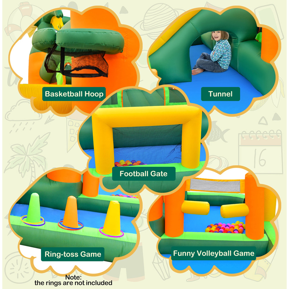 Transform your garden into a tropical paradise with the 8-in-1 Tropical Inflatable Bounce House with 2 Ball Pit Pools! This vibrant and expansive play area not only features a striking palm tree design but also includes a variety of sports-themed activities that cater to every child's interests. From a soccer ball gate and volleyball gate to a basketball hoop, this inflatable castle is perfect for encouraging physical activity and sportsmanship. The large jumping area and wide slide provide endless fun, while the dual ball pit pools, tunnel, and ring-toss game offer more ways to play. Safety is prioritised with ventilated mesh walls and a sturdy design, ensuring peace of mind while kids have the time of their lives.