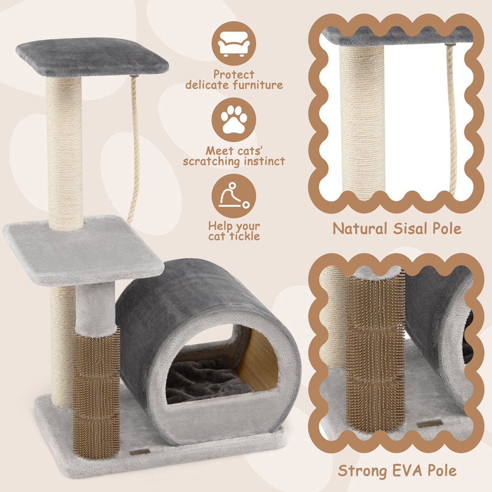 Ensure your feline friend enjoys the ultimate play and relaxation space with the Costway 85cm Grey Sisal Rope Cat Tree Scratcher with Groom Brush. Featuring a top perch and platform for surveying their kingdom or simply enjoying the view, this cat tower is a true haven of fun and comfort. The included sisal rope ignites curiosity and offers endless entertainment, while the breathable bamboo mat in the rest house provides a cool, comfy spot for naps. The built-in grooming brush and durable scratch post cater to their health, allowing for self-massage and claw maintenance, diverting their attention from your furniture. Crafted from skin-friendly plush and natural, safe materials like sisal and EVA, this condo is designed with stability and style in mind, easily integrating into any room decor.