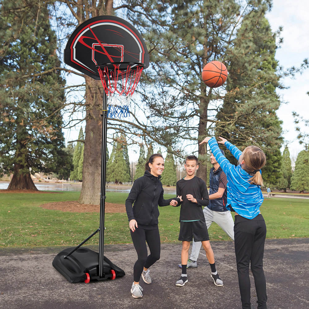 Elevate your game with this weather-resistance Costway Basketball Hoop System with Adjustable Height, perfect for players of all ages! This robust hoop system boasts six levels of height adjustment, ranging from 170cm to 230cm, ensuring it meets the needs of both children and adults. The durable polypropylene net, anti-rust steel rim, and hook are built to withstand outdoor elements, making it an ideal choice for garden, driveway, or schoolyard basketball sessions. With its easy mobility, thanks to built-in smooth wheels, this basketball hoop can be moved effortlessly to different locations, enhancing your playing experience wherever you go. You can fill the base with 30l water or 45kg sand for stability.