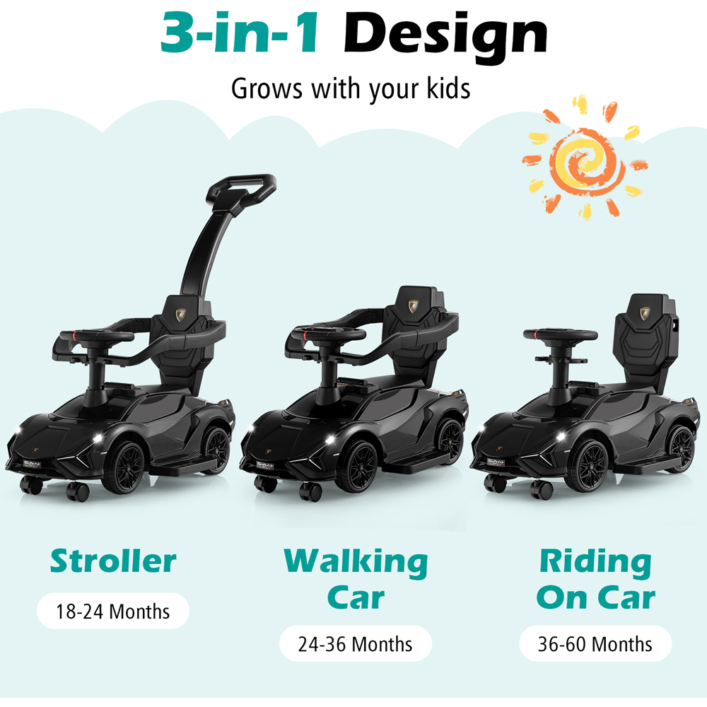 Encourage active play for your little one with the Costway Black 3-in-1 Kids Ride On Push Car. It can be used as a stroller (for 18-24 months old), walking car (for 24-36 months old) and riding on car (for 36-60 months old). The steering wheel enables kids to operate as they like, while the grip handle is designed for parents to push and control. Universal wheels allow parents to control the direction freely. And this part is easy to disassemble. The side guardrails and backrest ensure a safe riding experience. ASTM and CPSIA certifications can also guarantee overall security. What's more, the headlights, music and hidden storage space can also bring toddlers much joy. This licensed Lamborghini car is easy to switch between a stroller, riding-on car and walking car, which is suitable for 18-60 months old kids. This toddler ride-on push car is equipped with removable guardrails and a detachable push handle for safety. With the two unique universal wheels, parents can conveniently control its direction with the push handle to better ensure their little one's safety. Also, the universal wheels can be easily detached when not in use. The realistic steering wheel is perfect for toddlers to manually control direction when the universal wheels are removed. The power switch, music button, headlights, USB port and volume buttons ensure endless driving fun. Plus, there is a hidden storage space for kids to store their "treasure". Made from premium PP and a metal frame it is strong and durable enough to serve kids for a long time. It can support up to 25 kg. Four wear-resistant and anti-slip wheels will move steadily on flat surfaces, such as wood floors, cement roads or brick roads. The smooth seat and extra footrest provide the utmost comfort during riding. Its foot-to-floor design helps kids exercise their leg muscles.