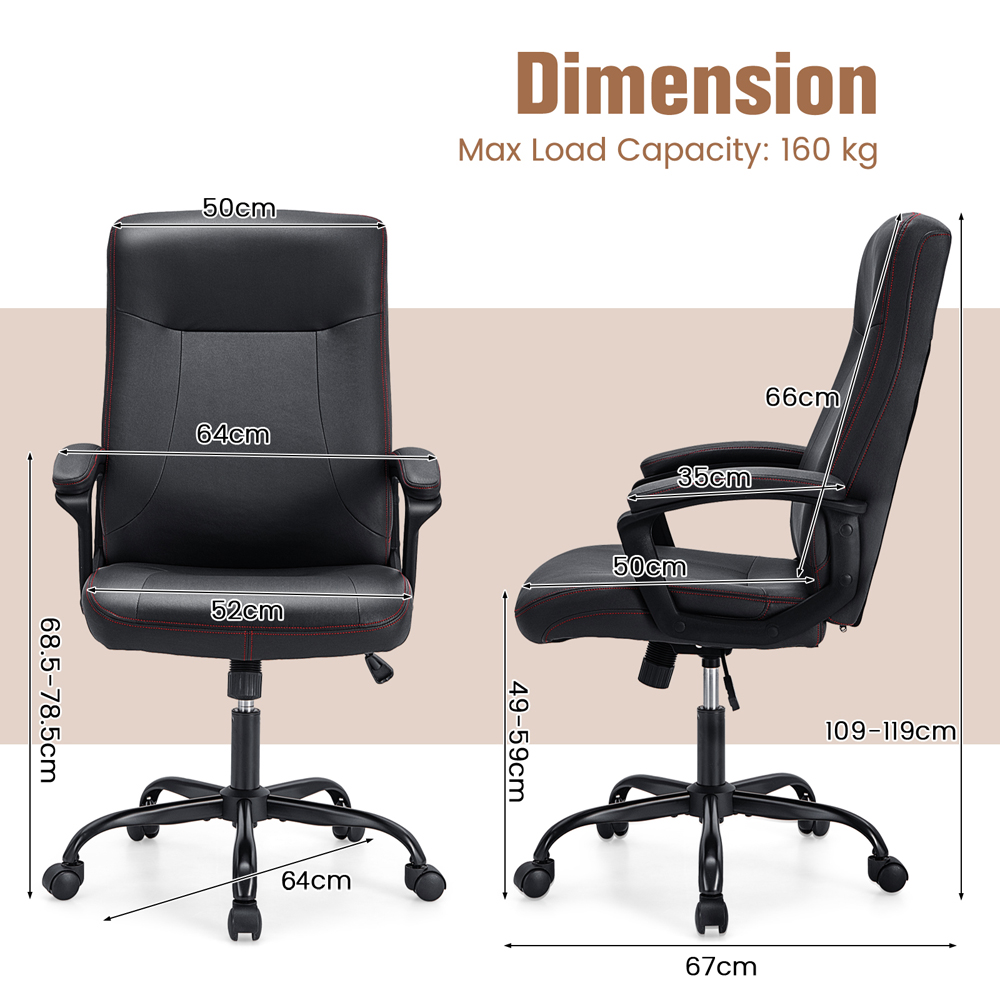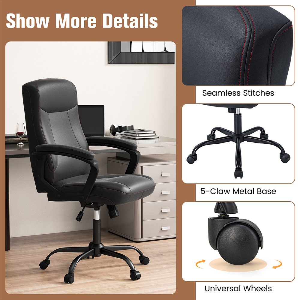 Elevate your workspace with the Costway Black Ergonomic High Back Swivel Office Chair, designed to blend superior comfort with a sleek, modern aesthetic. This chair features a premium leatherier cover and tightly stitched seams, ensuring both style and durability. The high-density sponge offers enduring comfort, perfect for long work sessions. With its adjustable seat height and rocking back function, you can tailor the chair to meet your personal comfort needs. The robust metal base supports up to 350 pounds, making it a reliable choice for anyone seeking a blend of style and functionality in an office chair.