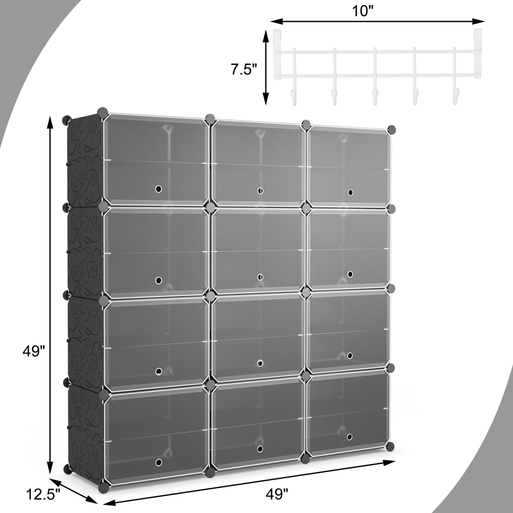 Make a functional addition to your home decor with the Costway Black Expandable Shoe Storage Cabinet. The 12-cube shoe rack organiser provides a large storage capacity for keeping 48 pairs of different kinds of shoes. Each cube is divided into two layers with a partition that can be removed to fit high heels and boots. The transparent doors protect your items from dust while allowing you to find what you need quickly. The cut-out hole promotes air circulation to avoid peculiar odours. The sturdy steel support and durable PP panels endow the storage unit with a sturdy and durable structure. The eight-tier storage organiser is a good storage solution for lightweight items. It is ideal for storing clothing, bags, books and other sundries, suitable for an entryway, kid's room, bedroom or dormitory. You can also hang your bags, hats and umbrellas on the side hook for easy access. This shoe stand is easy to assemble and can be personalised according to your preference. It is made of high-quality PP material and sturdy steel and is strong enough to bear your shoes. The stable cubic structure and firm connection ensure excellent sturdiness, leaving you no worry about collapsing or deformation.