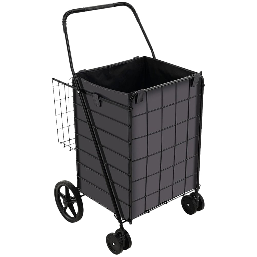 Transform your everyday shopping routine with the Costway Black Folding Shopping Cart with Oxford Liner. The cart is designed with a spacious front basket, as well as an additional back basket, to fulfil all your storage needs. The front basket, with a 27-gallon large capacity, allows you to store different items in it, such as vegetables, snacks, drinks, clothes, tools and so on. In addition, the 5-gallon extra back basket offers a safe place to store your belongings when hanging in the market. Plus, all your items will be well-protected with the thoughtful 420D Oxford liner. To ensure stability and long-lasting use, the cart features a strong metal frame. The premium rubber wheels, which are anti-slip, shock-absorbing and wear-resistant, are designed for effortless movement. The universal front wheels ensure simple operation and direction change. When not in use, the cart can be conveniently folded into a compact size, saving valuable space in your home or car trunk. Overall, this folding shopping cart is a must-have for your everyday necessities. Featuring a non-slip texture, the handle enables you to grip it firmly. Plus, the reinforced metal frame ensures high stability and durability.