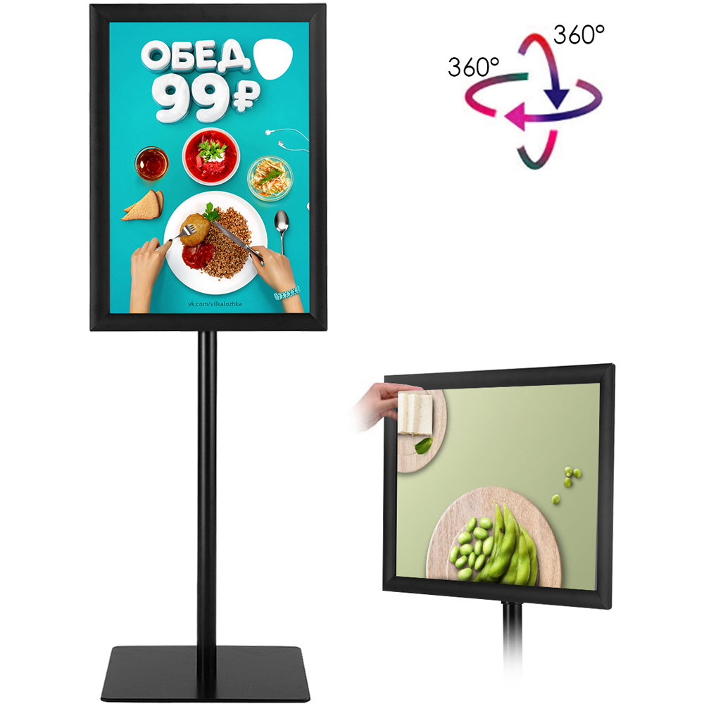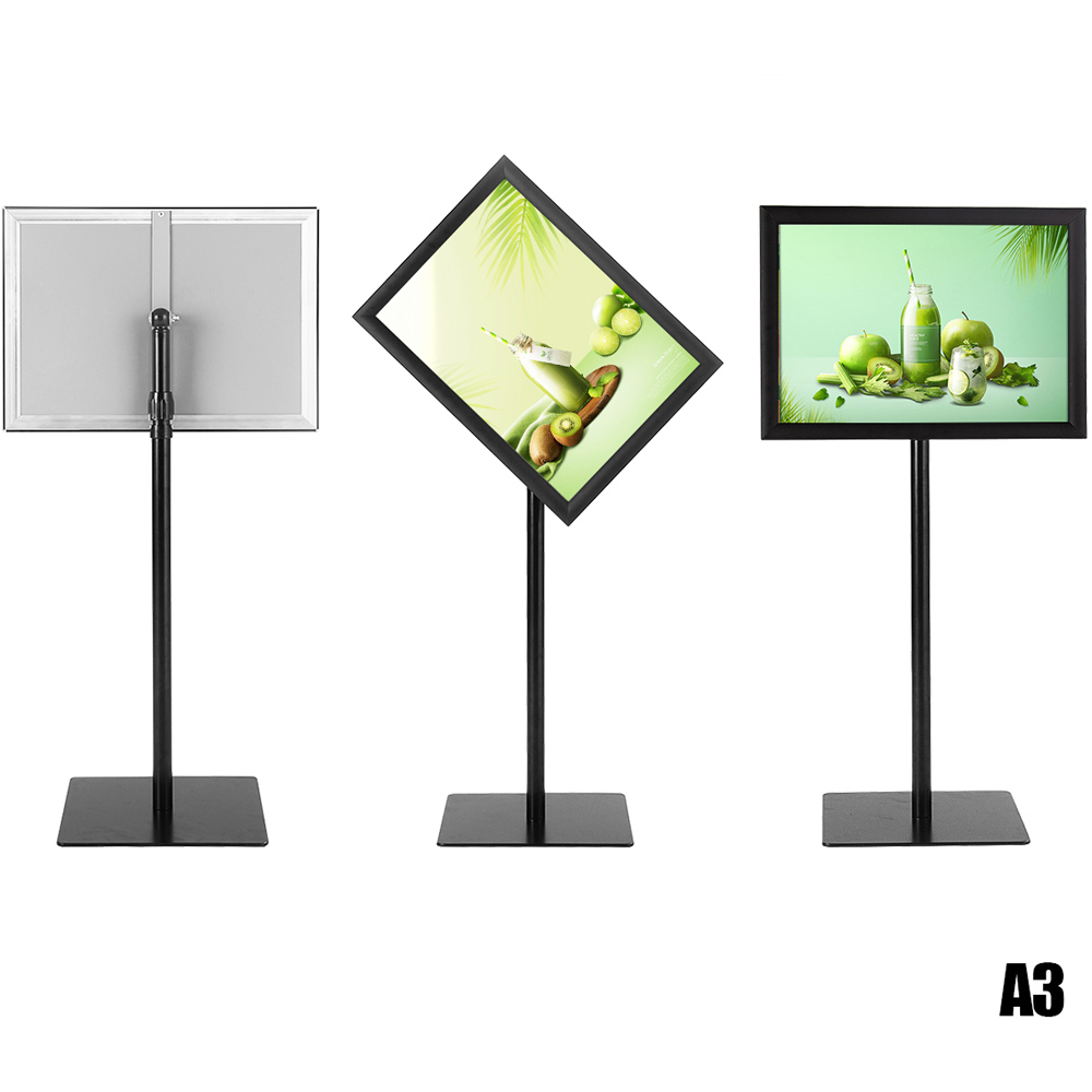 Elevate your display game with the Costway Black Height Adjustable Rotatable Poster A3 Information Stand. It is a versatile and robust tool designed to showcase your posters with style and ease. Crafted from high-quality materials and built to last, this stand features a unique snap-in frame design for effortless poster changes without the need for tools. Whether it's for a café, boutique, hotel lobby, or even your home, the adjustable and rotatable frame allows for perfect viewing at any angle, either horizontally or vertically. The non-glare lens protects your posters from dirt and fingerprints, ensuring they remain pristine and visible. Plus, the sturdy floor sign holder base enhances stability, making it ideal for both indoor and outdoor use. Simple to assemble and incredibly effective, this poster stand is a must-have for anyone looking to make a professional impact with their displays.