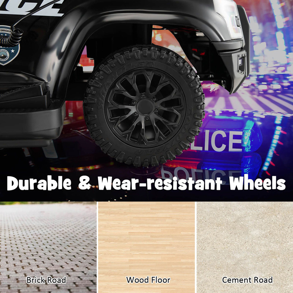 Watch your little one play around in style with Costway Black Kids Ride On Police Car. Lifelike warning lights, siren sounds and megaphone design ensure an enjoyable riding experience. 6V rechargeable battery and built-in strong motor ensure a safe speed of 1.86 mph. Besides, with 4 durable wheels, kids can ride on wood floors, cement roads, brick roads and more. And its hidden storage offers kids more space to store their books, snacks and toys. To guarantee kids' safety, it is designed with a bottom anti-tilt device and a safe backrest. ASTM and CPSIA certifications also add more security. The spacious seat and wide footrest keep it comfortable to ride. What's more, this electric vehicle offers kids driving fun and promotes their motor skills as well as hand-eye coordination. Designed with delicate police car stickers, flashing warning lights and a megaphone design, this ride on police car makes kids feel like a real policeman. And kids can push the red button of the megaphone to amplify their sounds through the megaphone, adding more fun. Multimedia player provides kids with more riding joy. An extra USB port and TF interface enable it to connect with external devices for more music. Apart from that, under-seat storage enables kids to store their toys, snacks and other small items. This toddler riding toy features a bottom anti-tilt device and a safe backrest to avoid kids' leaning back and better ensure their safety. In addition, comfortable seats and wide footrests allow your kids to ride comfortably. With a 6V rechargeable battery and a built-in strong motor, this toy police car can reach a safe speed of 1.86 mph. On the other hand, with durable and wear-resistant wheels, this riding toy is suitable for different road conditions, such as wood floors, cement roads, brick roads and more. This police car with a cool outlook is an ideal gift for 18-60 months old kids. The seat can hold a weight of up to 25 kg.