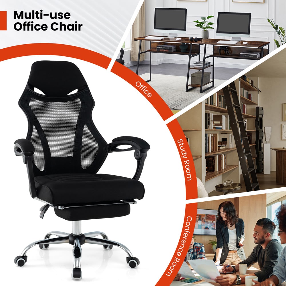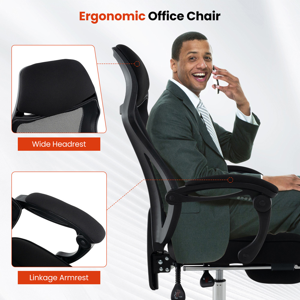 Experience the pinnacle of comfort with the Costway Black Mesh Adjustable Office Chair with Footrest. This chair is designed to provide unparalleled support and flexibility in your workspace. Adjust the backrest from a straight 90° to a more relaxed 135° angle, and find your perfect sitting position with the height-adjustable seat and back. The retractable footrest and linkage armrests offer additional comfort for your limbs, making long hours at the desk more bearable. Built with a sturdy five-claw base and equipped with smooth-rolling universal wheels, this chair ensures stability and mobility. The high-quality mesh fabric paired with dense sponge padding not only enhances breathability but also offers lasting resilience for prolonged use.