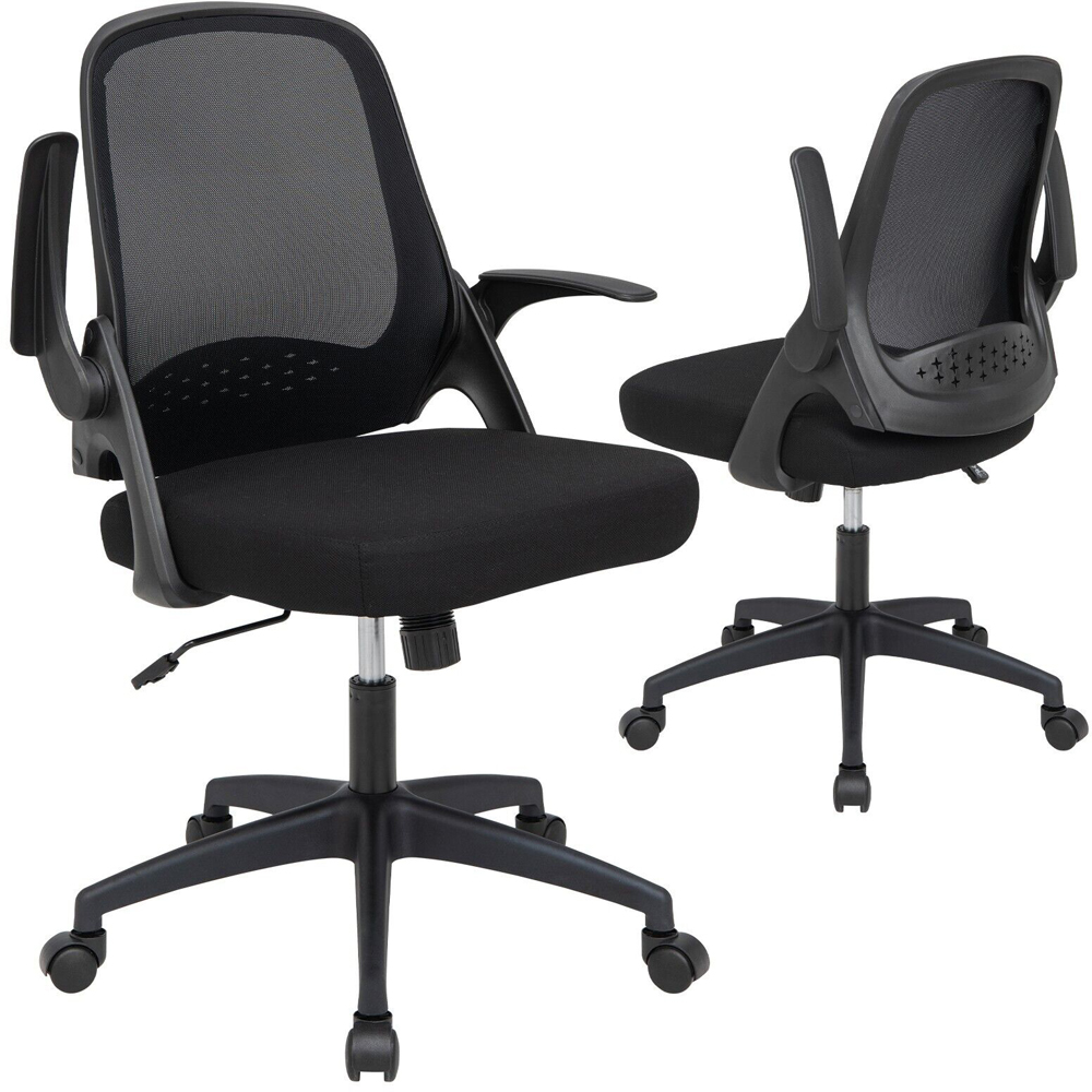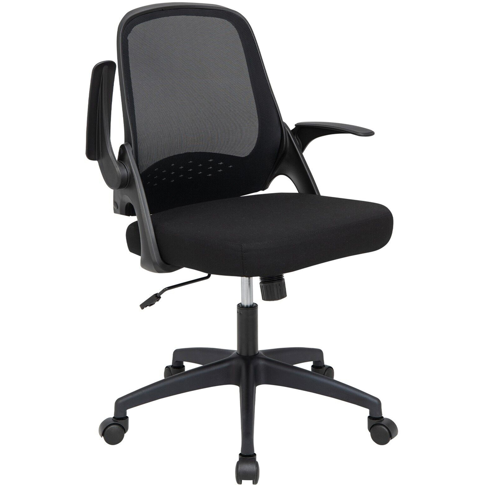 Experience comfort that adapts to your needs with the Costway Black Mesh Swivel Office Chair. Designed for long hours of use, this chair features a breathable mesh back that ensures airflow and optimal heat dissipation, keeping you cool and comfortable. The high-density sponge cushion maintains its plumpness and provides enduring support, while the ergonomic back with lumbar support protects your spine and reduces fatigue. Flip-up armrests transform it into an armless chair for space efficiency, and the adjustable backrest with rocking tension control allows you to find your perfect seating angle. Suitable for any workspace, this chair's height can be adjusted to match various desk heights, ensuring a correct posture throughout your workday.