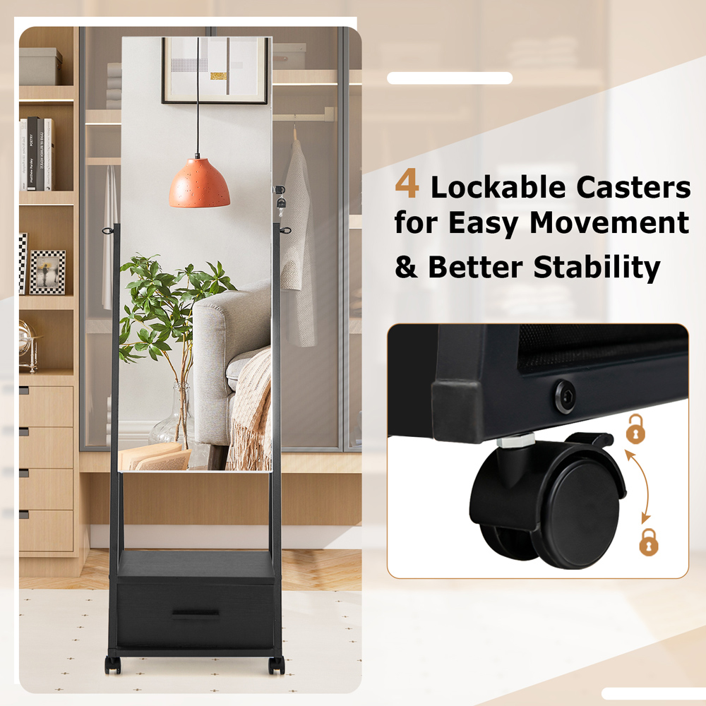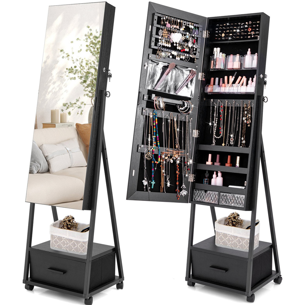Maximise your space and style with the Mobile Standing Lockable Jewellery Cabinet with Full Length Mirror. This versatile piece combines a frameless full-length mirror, a spacious storage drawer, and a jewellery cabinet into one sleek unit, enhancing both functionality and elegance in your room. With its lockable door and wheels, it ensures both mobility and security, allowing you to move it effortlessly and keep your valuables safe. The robust construction with premium MDF and an iron frame guarantees long-lasting use, while the velvet-lined interior protects your jewellery from scratches. Whether in your bedroom, entryway, or locker room, this jewellery cabinet is an excellent choice for organising and storing various accessories, making it an ideal gift.