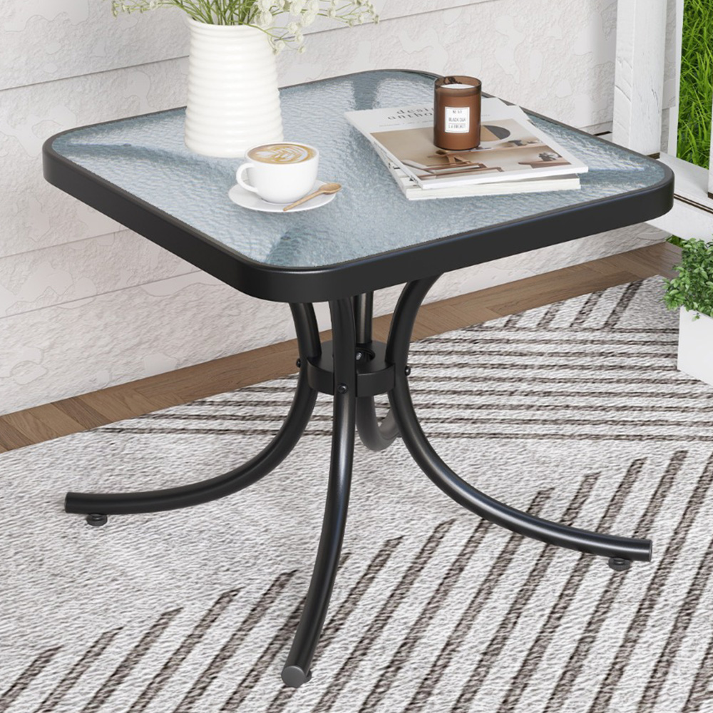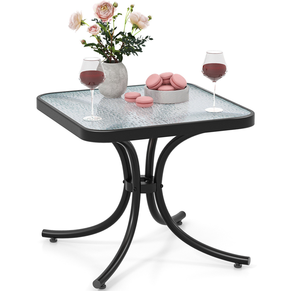 Elevate your outdoor décor with the Costway Black Tempered Glass Top Patio Table. This square side table helps you to keep all the daily essentials you need at your fingertips The top can be used for snacks, wines, books or cups, making your outdoor relaxation time convenient and fun. The tempered glass tabletop is cold and heat-resistant, allowing you to place drinks or ice buckets the way you wish. The tabletop is also waterproof and scratch-resistant, making daily cleaning effortless. Constructed with a heavy-duty metal frame, this small table ensures long-term reliable use. It also comes with adjustable foot pads that not only boost stability but also protect floors from scratches. Apart from just a side table, it can also serve as a compact coffee table or bedside table. This table is suitable for various indoor and outdoor settings such as living rooms, gardens, or poolside areas. Measuring 50 x 50 x 45cm, this outdoor side table is convenient to set up with necessary accessories labelled for identification. Just follow the instructions in the manual for assembly.