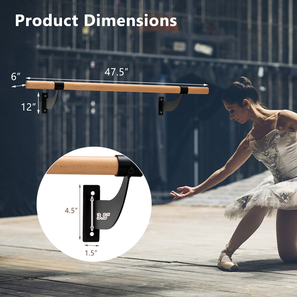 Upgrade your ballet routine with the Costway Black Wall-Mounted Beech Wood Ballet Barre 120cm. It is crafted with selected beech wood, which ensures long-term use. It is also characterised by high strength and deformation resistance. Moreover, through delicate polishing treatment, the wood surface is smooth and burr-free, which is safe to use. It comes with 2 sturdy metal brackets, 2 fixing screws, and 4 expansion screws. Therefore, it can be easily mounted on the wall at your desired height. Besides, the high-strength and solid screws ensure good stability and sturdiness. This 4 cm diameter ballet barre provides comfy grips and superior strength. This is typically suitable for a variety of activities, such as workouts, stretching, training ballet poses, exercising yoga and more. Plus, with its exquisite wooden grains, the ballet barre can perfectly blend into any home style. It is suitable for beginners, advanced dancers, or the average crowd interested in developing flexibility and strength. It can be a perfect way to correct body posture, strengthen muscles, boost bones' growth, and improve ballet skills. It is suitable for schools, homes, dancing studios, dancing clubs, and gyms.