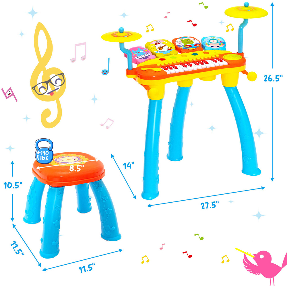 Make a musical addition to your little one’s toy collection with the Costway Blue 24 Keys Piano Keyboard Drum Set with Stool. It features eye-catching LED lights with a 24-key piano keyboard and is equipped with eight drum sounds, four cymbal sounds, four DJ sound effects, four music sound effects, four tones and two rhythms. The record and playback function helps record and review their songs. Children can appreciate, listen to or follow eight built-in demos and ten world-famous songs. The headset microphone brings kids much convenience for immersive singing. The MP3 audio input jack allows you to connect the keyboard to your mobile phone to play music. It features safe materials with a smooth edge and a round-corner design. It can improve their hand-eye coordination, and vocal and language skills, with auditory development. It is crafted from premium ABS and PP material with exquisite workmanship, and it has no burrs and sharp corners. The stable round stool provides children with a comfortable sitting experience.