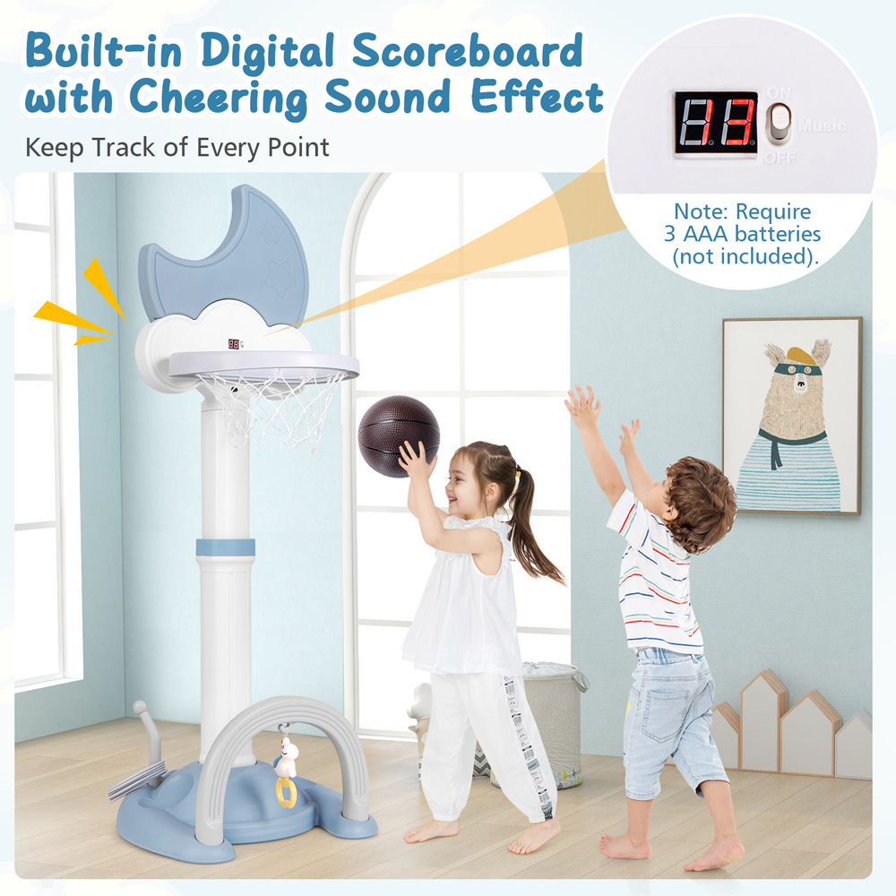 Add a playful touch to your little one’s toy collection with the Costway Blue 4-In-1 Basketball Hoop with Adjustable Height. It is crafted using sturdy HDPE and PP materials and is ideal for indoor and outdoor play. This adjustable basketball hoop is a versatile activity set that encourages children to grow while having fun. It is equipped with a moon-shaped electronic scoreboard for real-time feedback. This amazing sports centre combines basketball, ring toss, mini golf and football for real fun and healthy exercise. You can encourage your children to stay active and improve their concentration, balance, strength, motor skills, and hand-eye coordination with this set. The large base structure enhances overall stability and reduces the risk of falling over. It can be adjusted to nine height levels between the range of 76 to 114cm. The gymnastics bar can be easily modified with a height-fixing clip to accommodate users of different ages. It helps in promoting parent-child bonding and improving relationships through exciting games and activities. Note: The scoreboard requires 3 AAA batteries (not included).