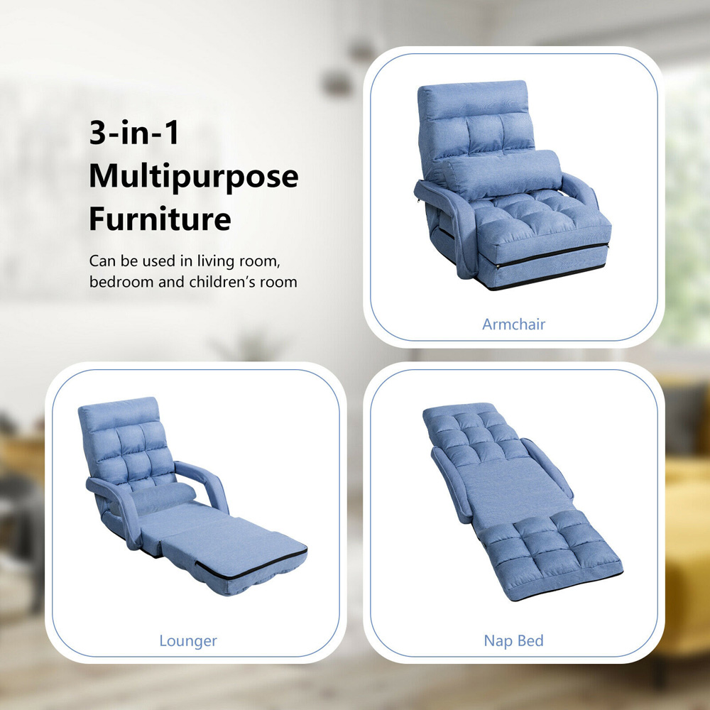 Transform your bedroom with the Costway Blue Adjustable Foldable Floor Chair. This folding floor chair has various uses, such as a gaming chair or a lounge chair. It can be used while you read, play games or watch TV, but it also folds out to make a bed for taking a nap. It features a modern style that perfectly fits any decor in your living room, bedroom, dormitory or office. This floor chair is designed to meet your needs with five adjustable backrests from 90° to 180°. It adopts a streamlined design and perfectly fits your body, preventing backache and spinal pain. This floor chair is suitable for long periods of use. The chair is equipped with an additional pillow, and it folds out to a bed, offering a comfortable place to take a nap. The armrests are designed to stretch flat, impersonating a bad with nothing in the way. This chair is thoughtfully designed with a detachable cushion seat, making it suitable for all. The chair is padded using a high-density sponge covered in a linen fabric, which is breathable and removable for washing. The frame is made from high-grade steel, which adjusts and better supports your body weight. The chair can be folded into a cube to save space when not required.