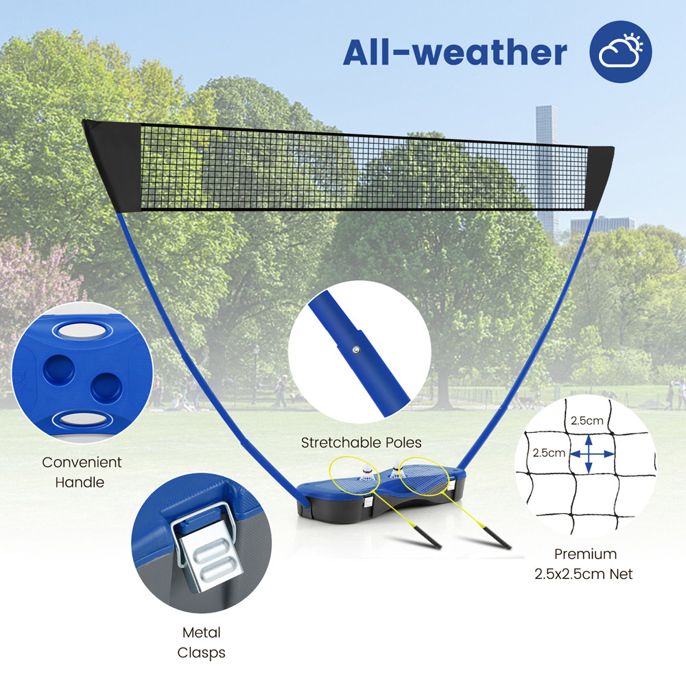 Elevate your outdoor activities with the Costway Blue All-In-One Portable Badminton Net Set, perfect for family gatherings, beach days, and more! This versatile set not only offers a quick and easy setup but also includes everything you need for a fun-filled game of badminton or volleyball. With its durable storage base that doubles as a carrying case, you can effortlessly transport this set to any location. Crafted from high-quality materials, it's designed to withstand the wear and tear of both indoor and outdoor use, ensuring endless hours of entertainment.