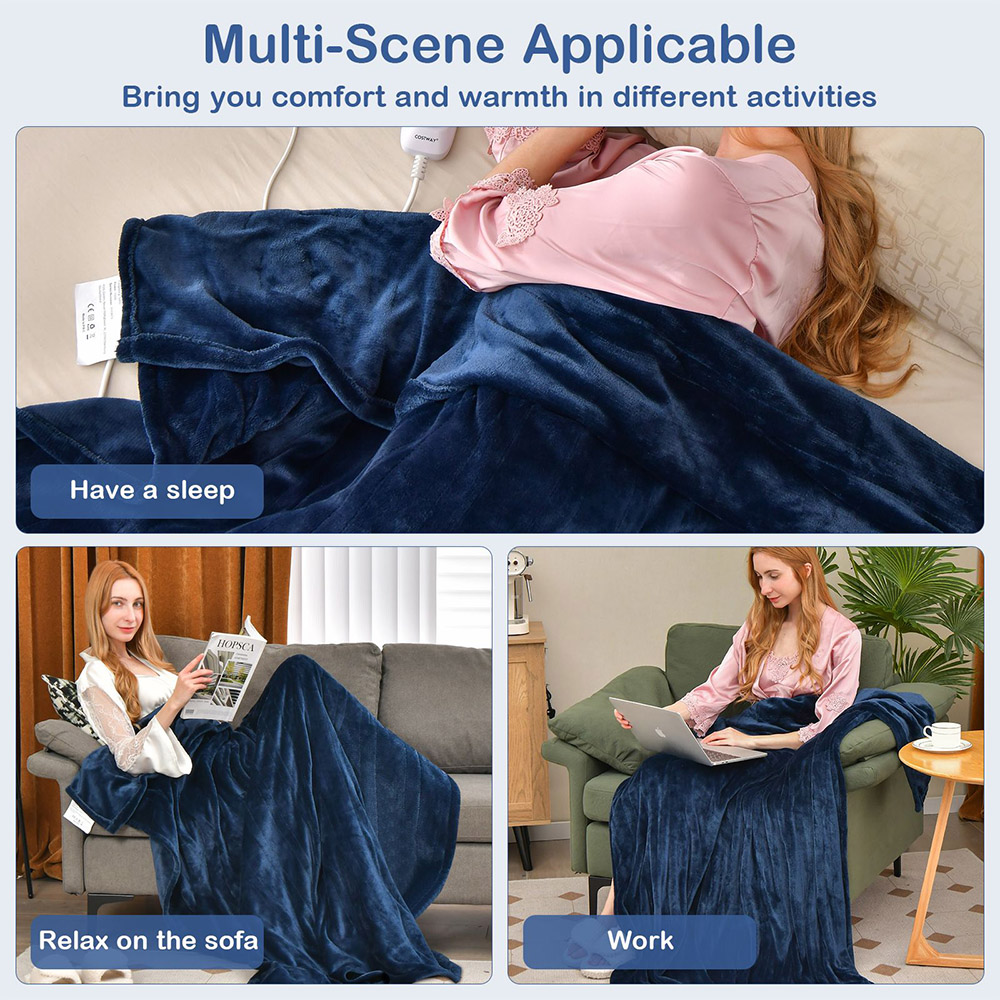 Sooth your body and mind with the ultimate warmth of the Costway Blue Electric Blanket with 4 Heat Settings 180 x 130cm. This blanket features high-efficiency and instant heating that quickly drives away your coldness. With four heating levels, you can easily choose the temperature you need as per your preferences. Both sides of this heating blanket are crafted from high-grade flannel, providing high-level comfort and stable heat conduction. Plus, the heating wire in the middle is up to 25mm long, offering better heating efficiency. For more convenience, the blanket includes an easy-to-operate remote control, letting you adjust the heating level smoothly. In addition, it is designed with eight-hour auto-off and overheat protection features to offer maximum safety. Measuring 180 x 130cm, this electric heated blanket is suitable for multiple occasions, whether you are sleeping, relaxing on the sofa or working. This blanket is both hand and machine-washable, maintaining its softness for longer and saving your effort. Just remember to unplug the power connection and disconnect the cord before washing. Please note that it is recommended to wash in cold water only and do not use until it is totally dried.