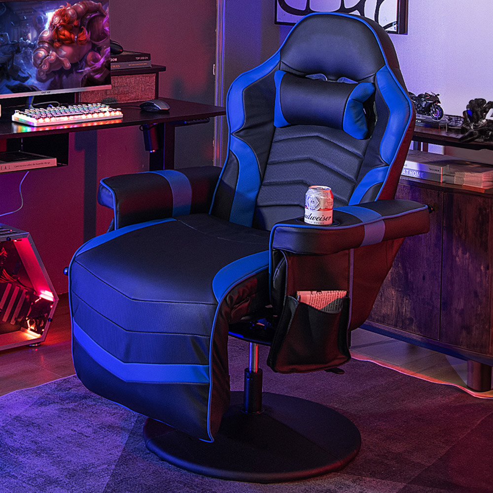 Elevate your gaming and work experience with the Costway Blue Electric Massage Gaming Chair with Cup Holder, a perfect blend of comfort and functionality. This chair features a massage function with four spots and eight modes, designed to relax your body and ease muscle tension. The adjustable backrest and footrest allow you to find your ideal sitting position, while the durable PU leather is both easy to clean and comfortable. With its humanized design, including a side pouch for storage and a cup holder for convenience, this chair is ideal for any setting, be it your office or gaming room.