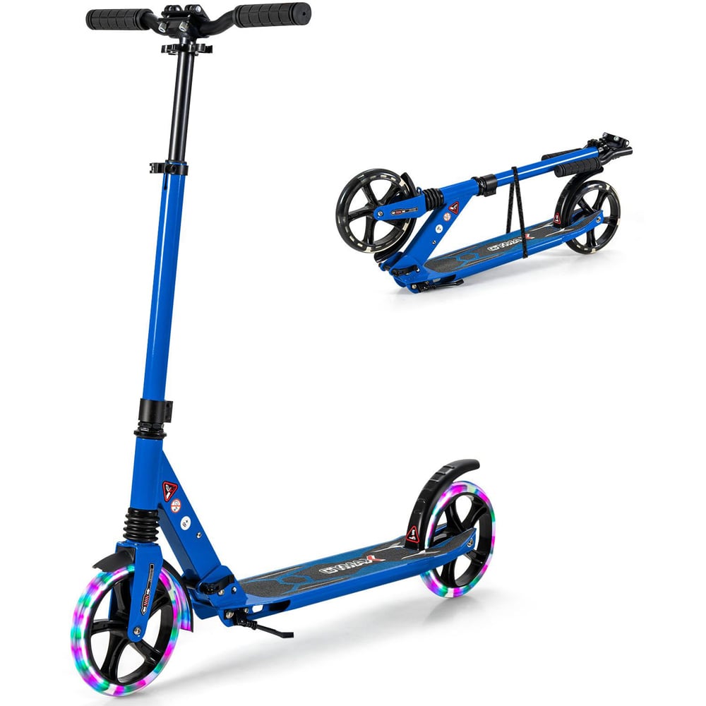 Discover a new way to navigate city traffic with the Costway Blue Folding Kick Scooter with Large Wheels. This scooter is equipped with a 3-gear height-adjustable T-bar, allowing you to tailor the handlebar height to suit your comfort. The front spring system is designed to absorb bumping and shock on uneven terrain. Also, a rear foot brake ensures quick stopping and reliable speed control. Ideal for users aged 8 years and above, it is built to accommodate a wide range of riders. Crafted from reinforced aluminium alloy, this scooter offers extra sturdiness and longevity, supporting a load capacity of 100kg. Its durable design ensures reliable performance over time, making it a long-term companion for both leisure and commuting. The front shock-absorbing system, paired with large and silent PU wheels, offers a smooth ride on uneven terrain. This practical kick scooter allows you to have a comfortable riding experience. While riding, the motion-activated LED lights in the wheels will light up to enhance view attractiveness. Plus, the large wheels will light up in a variety of colours when you ride the kick scooter, which provides extra fun for riding at night. The side kickstand can support the scooter to park well. There is no need to use any batteries, just work through the wheels rolling. This lightweight scooter with a one-second folding mechanism allows you to easily fold it for commuting and playing. When the scooter is not in use, you can fold it and store it in the cabinet. The included shoulder strap allows you to carry our sports scooter easily. Also, this folded scooter can be stored in a small locker without taking up much space.