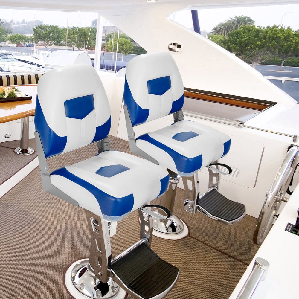 Settle into the ultimate marine seating experience with the Costway Blue Folding Low Back Boat Chair Set with Long Fixation Strap Set of 2. The combination of blue and white makes these chairs versatile for different kinds of boat styles. Besides, the fully filled high elastic foam provides a comfortable sitting experience. Plus, the waterproof PVC fabric withstands the rigorous marine environment completely. The curved backrest offers strong support to release back pressure after tired offshore activities. These chairs have the potential to load up to 115 kg. When these chairs are not in use, you can fold them and fix them with a long strap for better storage. In addition, assembling these chairs is ultra-easy to finish, which can be completed with the help of the instructions provided. You can install these on the stand (not included), which can be any standard 4-bolt swivel or pedestal with the help of stainless-steel screws that come along. These comfortable chairs have large seats, 141.5cm x 39cm, providing a luxury experience on the shaky boat. Covered by premium PVC and PP, these fishing boat chairs can withstand the long-term rigours of a marine environment. Weather-resistant surface ensures long-term outdoor use, showcasing lasting durability. In addition, the durable metal hinge ensures smooth flipping down and up. These chairs fit a standard 13.5x13.5 cm mounting bolt pattern and any standard 4-bolt swivel or pedestal will be fine.