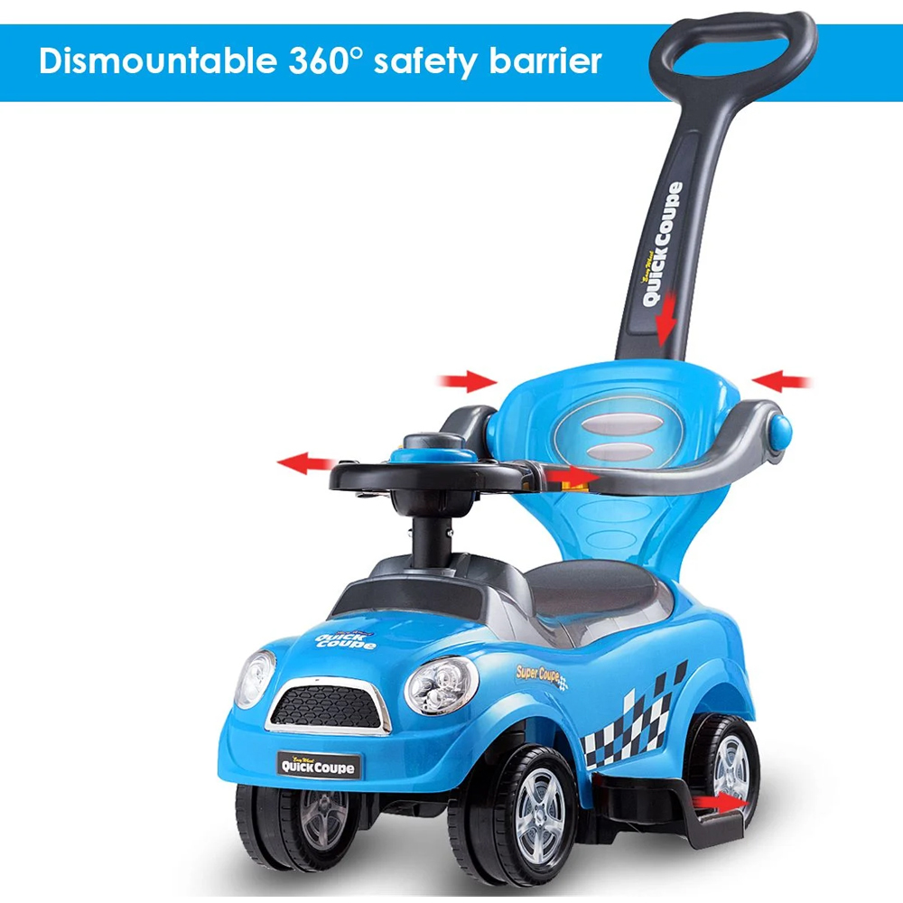 Encourage active outdoor play for your little one with the Costway Blue Kids 3 in 1 Ride on Car. It can be used as a stroller, walking car or riding car, which can accompany your little one for a long time. Kids can control the car with the steering wheel and press the horn button for more fun. Four wear-resistant wheels ensure smooth movement, bringing riding joy. It also has hidden storage space to place kids' toys or snacks. The detachable push handle helps parents to operate the car, the toy car is designed with removable guardrails, a safe backrest and an anti-back-tipping device for excellent security. This 3-in-1 ride-on push car perfectly combines a stroller, a walking car and a riding on car, which meets kids' needs of different growth stages. The foot-to-floor design enables kids to slide the car, which helps them exercise their leg muscles. Parents can control the car with the push handle to better protect kids' safety. Removable safety guardrails provide toddlers with all-around protection. The safe backrest prevents leaning back. Besides, there is an anti-back-tipping device to ensure added security. This ride-on push car comes with four premium wheels and one flexible steering wheel with one horn button for an enjoyable riding experience. It is made with quality and safe PP material makes it strong and sturdy enough to offer great support and hold a weight of up to 23 kg. Smooth surfaces and rounded corners protect your little one's delicate skin from being scratched during their riding process. This kid's ride-on push car will be a perfect gift for two-six-year-old toddlers.