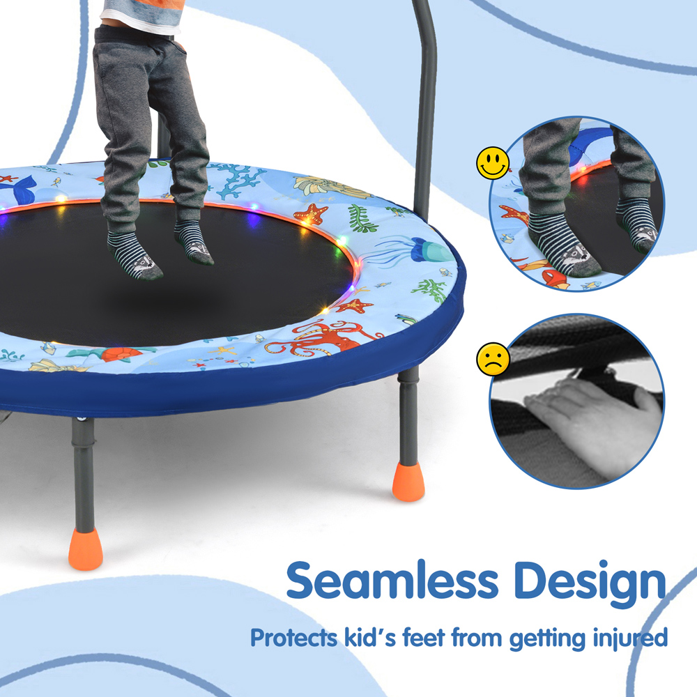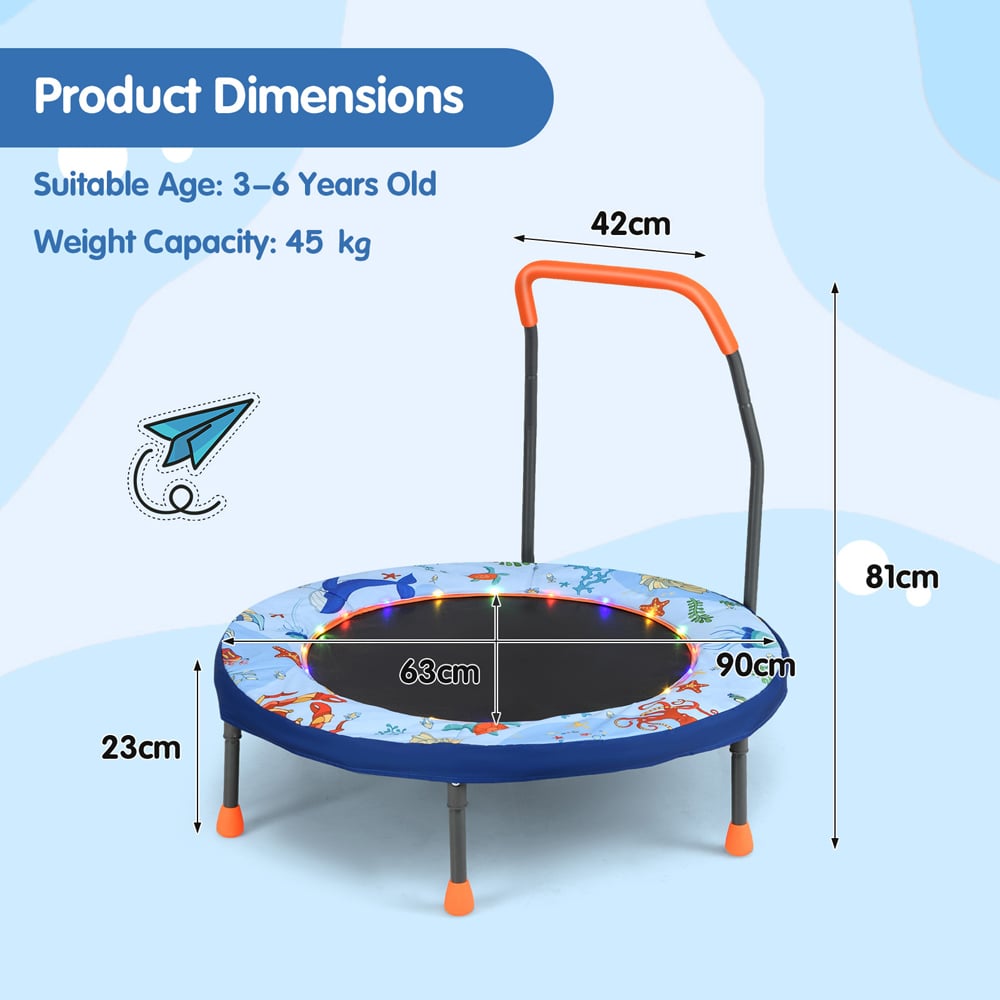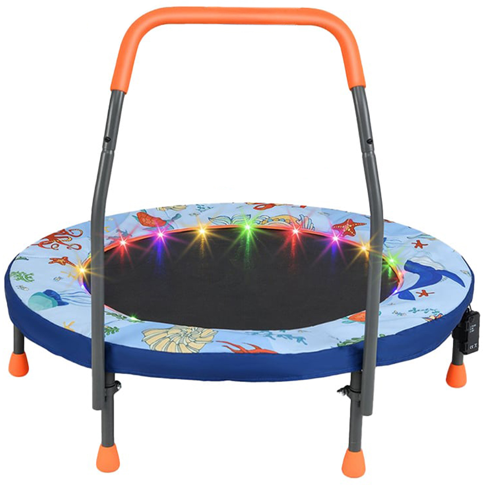 Elevate playtime to dazzling heights with the Costway 90cm Folding Mini Trampoline for Kids, featuring vibrant LED lights and a padded safety cover in a striking blue hue. This trampoline transforms any space into an exciting arena with its colourful LED lights that offer three engaging lighting modes, ensuring fun is never too far away. Designed for both indoor and outdoor use, it is equipped with a springless bounce system using tension bands, which not only provides a safer bounce but also reduces noise, making it perfect for quiet play areas. The robust, powder-coated frame coupled with non-slip foot pads guarantees stability and durability, while its foldable design allows for effortless storage and portability. Certified with EN71 and ROHS, this trampoline prioritizes your child's safety without compromising on fun.